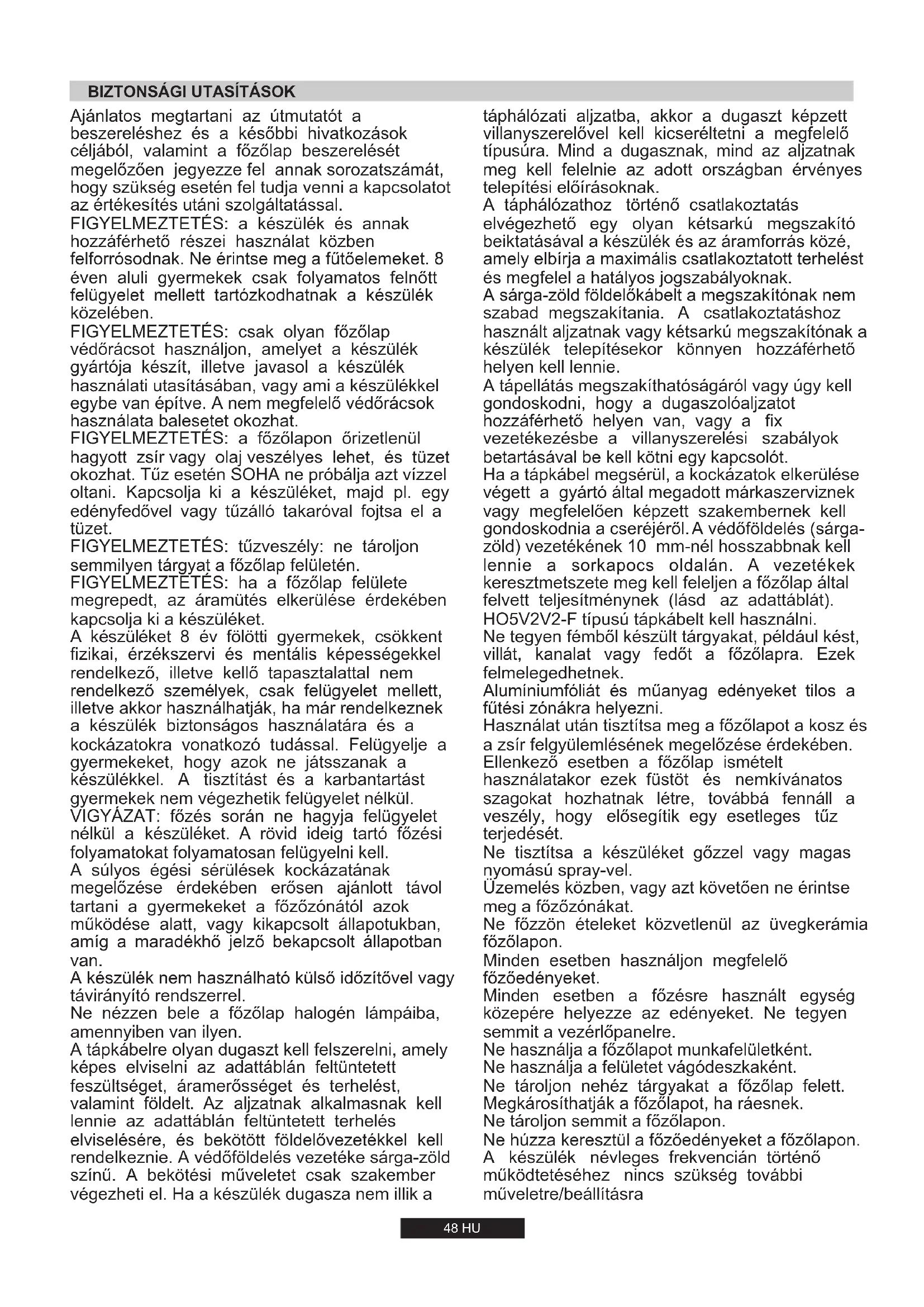7,7 kW 734 l/h 560 g/h -48 HU Ajánlatos megtartani az útmutatót a beszereléshez és a későbbi hivatkozások céljából, valamint a főzőlap beszerelését megelőzően jegyezze fel annak sorozatszámát, hogy szükség esetén fel tudja venni a kapcsolatot az értékesítés utáni szolgáltatással. FIGYELMEZTETÉS: a készülék és annak hozzáférhető részei használat közben felforrósodnak. Ne érintse meg a fűtőelemeket. 8 éven aluli gyermekek csak folyamatos felnőtt felügyelet mellett tartózkodhatnak a készülék közelében. VIGYÁZAT: főzés során ne hagyja felügyelet nélkül a készüléket. A rövid ideig tartó főzési folyamatokat folyamatosan felügyelni kell. A súlyos égési sérülések kockázatának megelőzése érdekében erősen ajánlott távol tartani a gyermekeket a főzőzónától azok működése alatt, vagy kikapcsolt állapotukban, amíg a maradékhő jelző bekapcsolt állapotban van. A készülék nem használható külső időzítővel vagy távirányító rendszerrel. FIGYELMEZTETÉS: a főzőlapon őrizetlenül hagyott zsír vagy olaj veszélyes lehet, és tüzet okozhat. Tűz esetén SOHA ne próbálja azt vízzel oltani. Kapcsolja ki a készüléket, majd pl. egy edényfedővel vagy tűzálló takaróval fojtsa el a tüzet. Ne nézzen bele a főzőlap halogén lámpáiba, amennyiben van ilyen. A tápkábelre olyan dugaszt kell felszerelni, amely képes elviselni az adattáblán feltüntetett feszültséget, áramerősséget és terhelést, valamint földelt. Az aljzatnak alkalmasnak kell lennie az adattáblán feltüntetett terhelés elviselésére, és bekötött földelővezetékkel kell rendelkeznie. A védőföldelés vezetéke sárga-zöld színű. A bekötési műveletet csak szakember végezheti el. Ha a készülék dugasza nem illik a FIGYELMEZTETÉS: tűzveszély: ne tároljon semmilyen tárgyat a főzőlap felületén. FIGYELMEZTETÉS: csak olyan főzőlap védőrácsot használjon, amelyet a készülék gyártója készít, illetve javasol a készülék használati utasításában, vagy ami a készülékkel egybe van építve. A nem megfelelő védőrácsok használata balesetet okozhat. FIGYELMEZTETÉS: ha a főzőlap felülete megrepedt, az áramütés elkerülése érdekében kapcsolja ki a készüléket. A készüléket 8 év fölötti gyermekek, csökkent fizikai, érzékszervi és mentális képességekkel rendelkező, illetve kellő tapasztalattal nem rendelkező személyek, csak felügyelet mellett, illetve akkor használhatják, ha már rendelkeznek a készülék biztonságos használatára és a kockázatokra vonatkozó tudással. Felügyelje a gyermekeket, hogy azok ne játsszanak a készülékkel. A tisztítást és a karbantartást gyermekek nem végezhetik felügyelet nélkül.