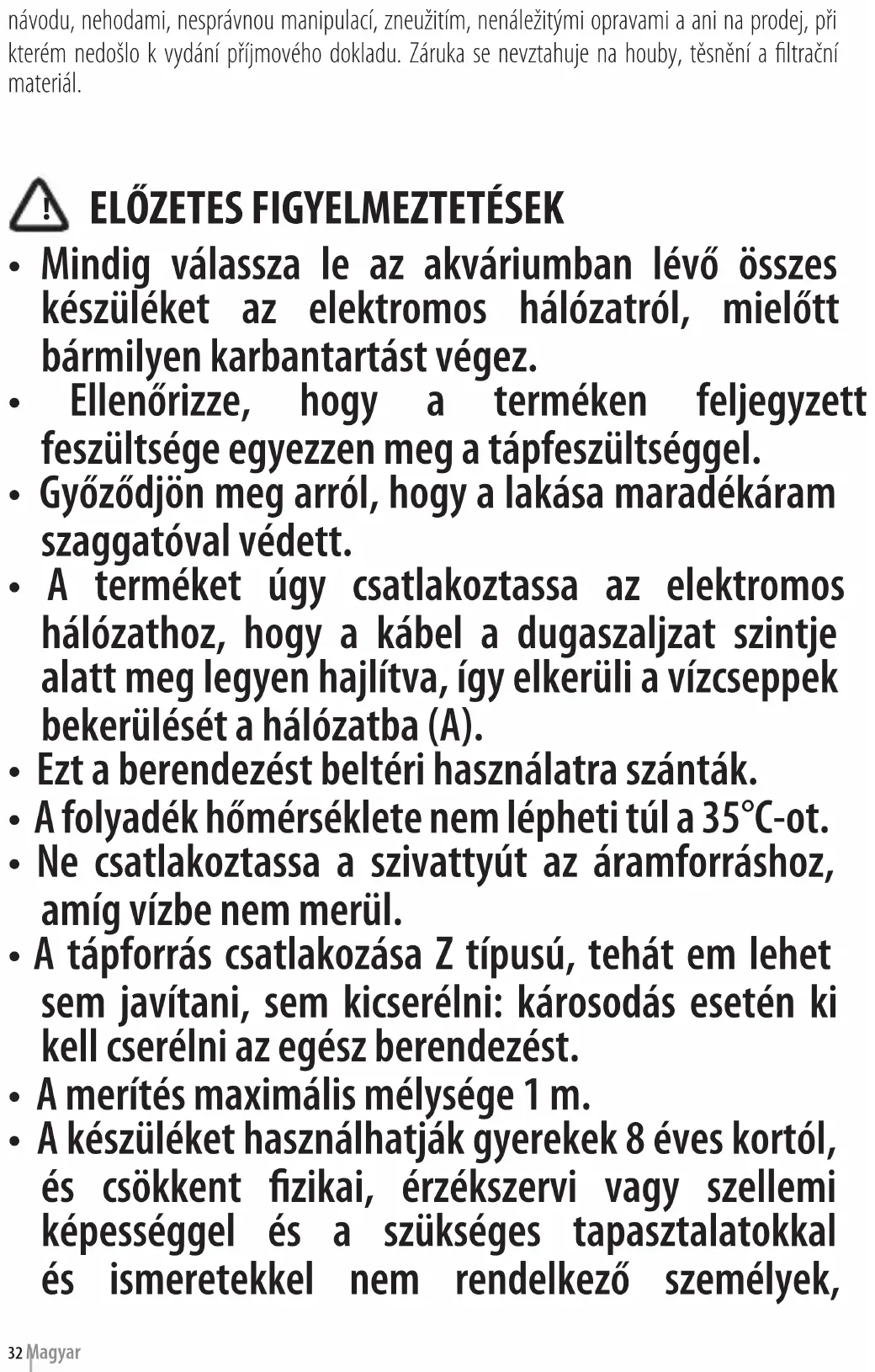 - Mindig válassza le az akváriumban lévő összes készüléket az elektromos hálózatról, mielőtt bármilyen karbantartást végez.