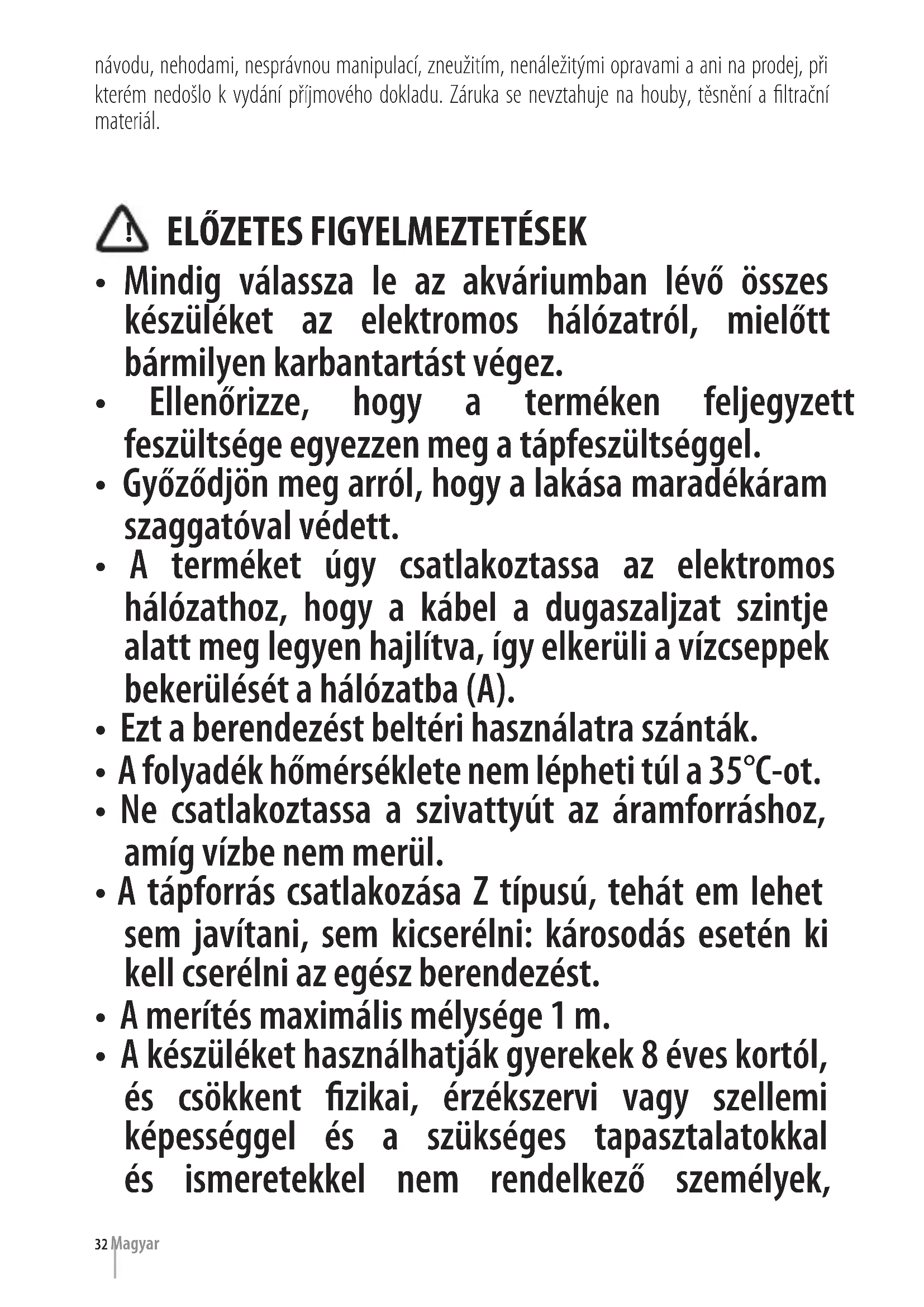 - Mindig válassza le az akváriumban lévő összes készüléket az elektromos hálózatról, mielőtt bármilyen karbantartást végez.
