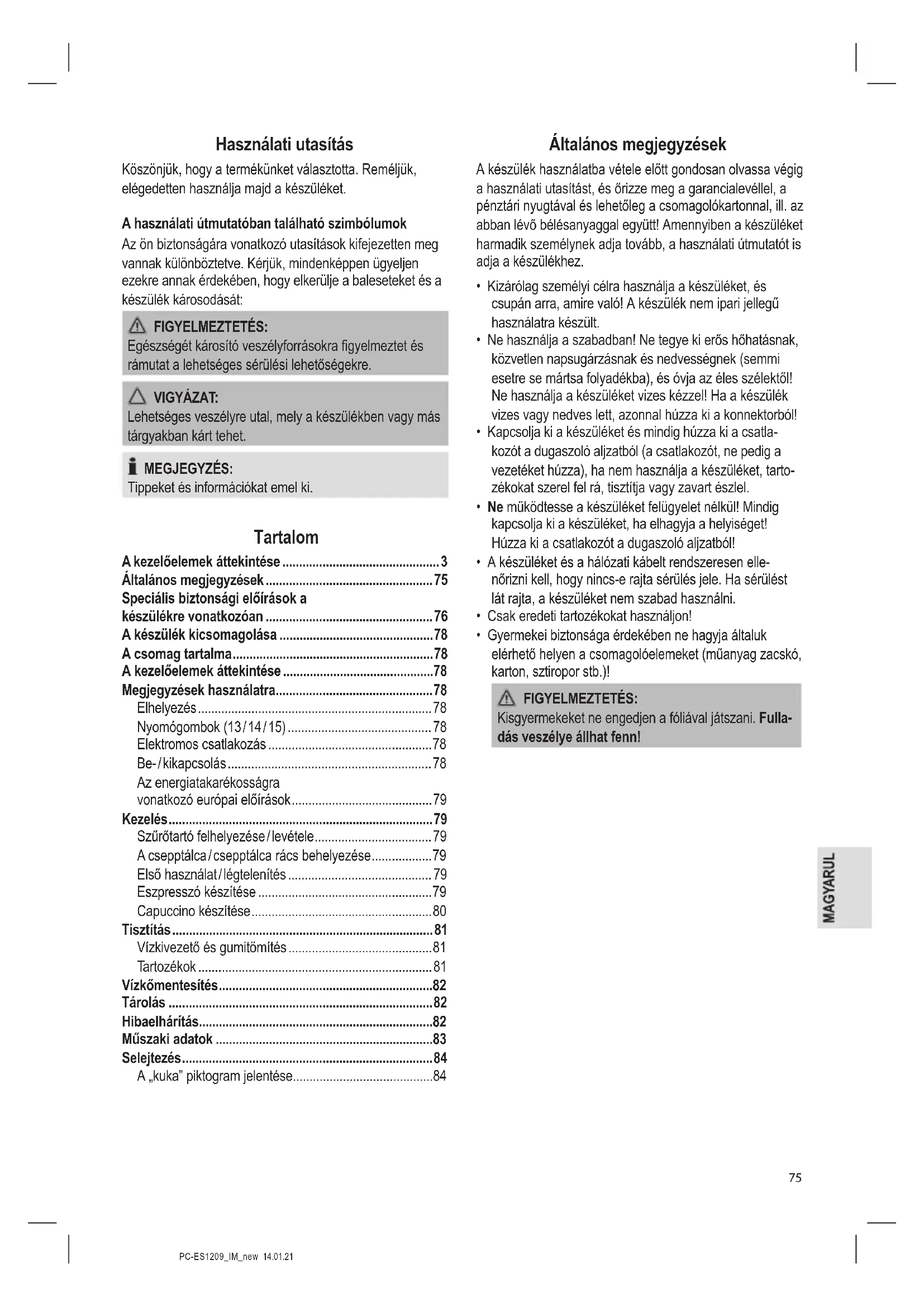 - Gyermekei biztonsága érdekében ne hagyja általuk elérhető helyen a csomagolóelemeket (műanyag zacskó, karton, sztiropor stb.)! FIGYELMEZTETÉS: Kisgyermekeket ne engedjen a fóliával játszani. Fulla- dás veszélye állhat fenn!PC-ES1209_IM_new 14.01.21