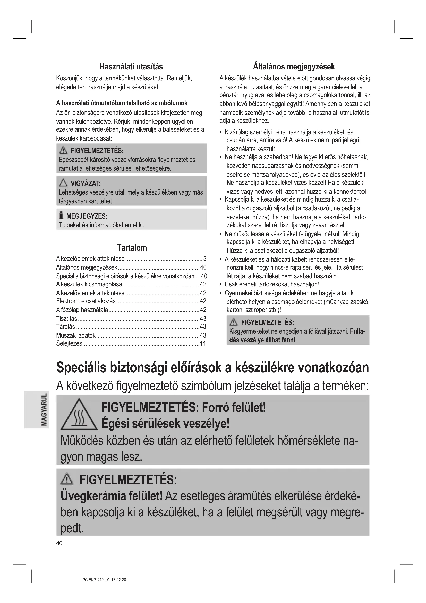 - Gyermekei biztonsága érdekében ne hagyja általuk elérhető helyen a csomagolóelemeket (műanyag zacskó, karton, sztiropor stb.)! FIGYELMEZTETÉS: Kisgyermekeket ne engedjen a fóliával játszani. Fulla- dás veszélye állhat fenn! Speciális biztonsági előírások a készülékre vonatkozóan A következő gyelmeztető szimbólum jelzéseket találja a terméken: FIGYELMEZTETÉS: Forró felület! Égési sérülések veszélye! Működés közben és után az elérhető felületek hőmérséklete na- gyon magas lesz. FIGYELMEZTETÉS: Üvegkerámia felület! Az esetleges áramütés elkerülése érdeké- ben kapcsolja ki a készüléket, ha a felület megsérült vagy megre- pedt.PC-EKP1210_IM 13.02.20