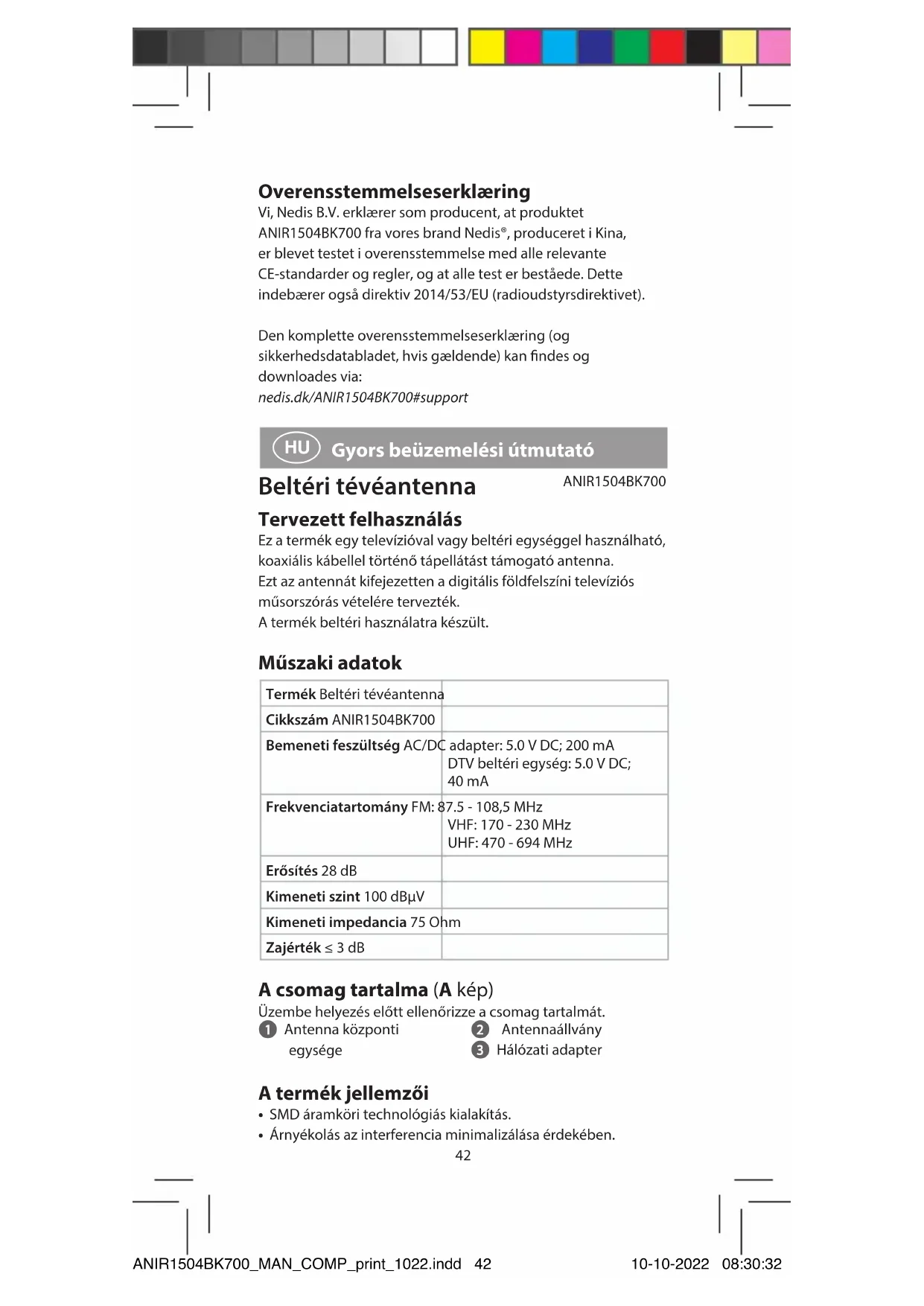 Ez az antenna függőleges és vízszintes helyzetben is képes működni, lásd B kép. Ártalmatlanítás Ez a szimbólum azt jelzi, hogy a terméket az EU-ban nem szabad kidobni a többi háztartási hulladékkal. A környezet vagy az emberi egészség lehetséges károsodásának megelőzését illetően Ön a felelős az újrahasznosításért a nyersanyagok fenntartható újrafelhasználásának népszerűsítéséért. A használt termék visszajuttatásához használhatja a szokásos visszaküldő és begyűjtő rendszereket, vagy kapcsolatba léphet azzal az üzlettel, ahol a terméket vásárolta. Ők gondoskodni tudnak a termék újrahasznosításáról. Megfelelőségi nyilatkozat A gyártó Nedis B.V. nevében kijelentjük, hogy a Nedis® márkájú, Kínában gyártott ANIR1504BK700 terméket az összes vonatkozó CE szabvány és előírás szerint bevizsgáltuk, és a termék minden vizsgálaton sikeresen megfelelt. Ez magában foglalja – nem kizárólagos jelleggel – a rádióberendezésekről szóló 2014/53/EU irányelvet. A teljes megfelelőségi nyilatkozat (és ha van, akkor a biztonsági adatlap) a: nedis.hu/ANIR1504BK700#support