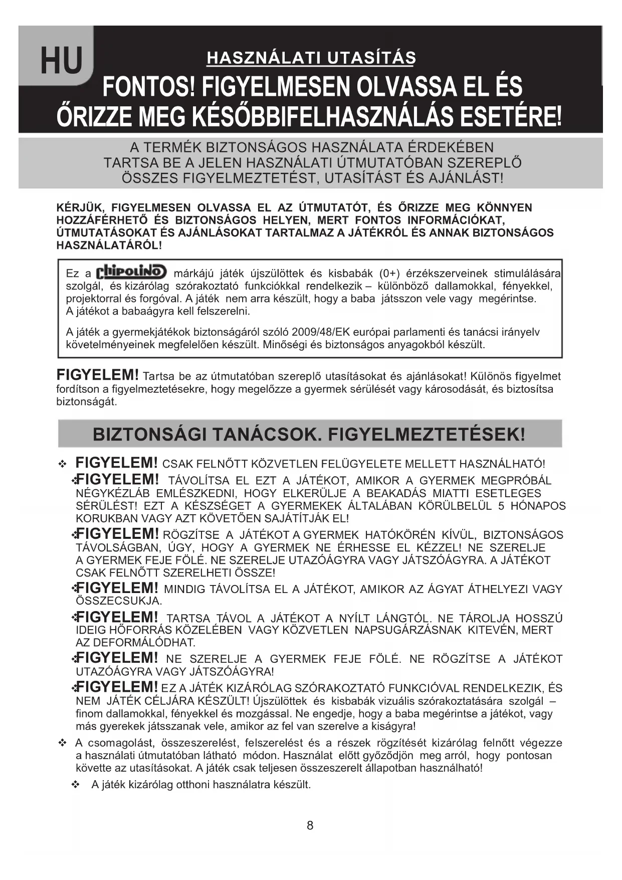 KÉRJÜK, FIGYELMESEN OLVASSA EL AZ ÚTMUTATÓT, ÉS ŐRIZZE MEG KÖNNYEN HOZZÁFÉRHETŐ ÉS BIZTONSÁGOS HELYEN, MERT FONTOS INFORMÁCIÓKAT, ÚTMUTATÁSOKAT ÉS AJÁNLÁSOKAT TARTALMAZ A JÁTÉKRÓL ÉS ANNAK BIZTONSÁGOS HASZNÁLATÁRÓL!Ez a márkájú játék újszülöttek és kisbabák (0+) érzékszerveinek stimulálására szolgál, és kizárólag szórakoztató funkciókkal rendelkezik – különböző dallamokkal, fényekkel, projektorral és forgóval. A játék nem arra készült, hogy a baba játsszon vele vagy megérintse. A játékot a babaágyra kell felszerelni.A játék a gyermekjátékok biztonságáról szóló 2009/48/EK európai parlamenti és tanácsi irányelv követelményeinek megfelelően készült. Minőségi és biztonságos anyagokból készült. FIGYELEM! Tartsa be az útmutatóban szereplő utasításokat és ajánlásokat! Különös figyelmet fordítson a figyelmeztetésekre, hogy megelőzze a gyermek sérülését vagy károsodását, és biztosítsa biztonságát. BIZTONSÁGI TANÁCSOK. FIGYELMEZTETÉSEK! FIGYELEM! CSAK FELNŐTT KÖZVETLEN FELÜGYELETE MELLETT HASZNÁLHATÓ! FIGYELEM! TÁVOLÍTSA EL EZT A JÁTÉKOT, AMIKOR A GYERMEK MEGPRÓBÁL NÉGYKÉZLÁB EMLÉSZKEDNI, HOGY ELKERÜLJE A BEAKADÁS MIATTI ESETLEGES SÉRÜLÉST! EZT A KÉSZSÉGET A GYERMEKEK ÁLTALÁBAN KÖRÜLBELÜL 5 HÓNAPOS KORUKBAN VAGY AZT KÖVETŐEN SAJÁTÍTJÁK EL! FIGYELEM! RÖGZÍTSE A JÁTÉKOT A GYERMEK HATÓKÖRÉN KÍVÜL, BIZTONSÁGOS TÁVOLSÁGBAN, ÚGY, HOGY A GYERMEK NE ÉRHESSE EL KÉZZEL! NE SZERELJE A GYERMEK FEJE FÖLÉ. NE SZERELJE UTAZÓÁGYRA VAGY JÁTSZÓÁGYRA. A JÁTÉKOT CSAK FELNŐTT SZERELHETI ÖSSZE! FIGYELEM! MINDIG TÁVOLÍTSA EL A JÁTÉKOT, AMIKOR AZ ÁGYAT ÁTHELYEZI VAGY ÖSSZECSUKJA. FIGYELEM! TARTSA TÁVOL A JÁTÉKOT A NYÍLT LÁNGTÓL. NE TÁROLJA HOSSZÚ IDEIG HŐFORRÁS KÖZELÉBEN VAGY KÖZVETLEN NAPSUGÁRZÁSNAK KITEVÉN, MERT AZ DEFORMÁLÓDHAT. FIGYELEM! NE SZERELJE A GYERMEK FEJE FÖLÉ. NE RÖGZÍTSE A JÁTÉKOT UTAZÓÁGYRA VAGY JÁTSZÓÁGYRA! FIGYELEM! EZ A JÁTÉK KIZÁRÓLAG SZÓRAKOZTATÓ FUNKCIÓVAL RENDELKEZIK, ÉS NEM JÁTÉK CÉLJÁRA KÉSZÜLT! Újszülöttek és kisbabák vizuális szórakoztatására szolgál – nom dallamokkal, fényekkel és mozgással. Ne engedje, hogy a baba megérintse a játékot, vagy más gyerekek játsszanak vele, amikor az fel van szerelve a kiságyra! A csomagolást, összeszerelést, felszerelést és a részek rögzítését kizárólag felnőtt végezze a használati útmutatóban látható módon. Használat előtt győződjön meg arról, hogy pontosan követte az utasításokat. A játék csak teljesen összeszerelt állapotban használható! A játék kizárólag otthoni használatra készült.9