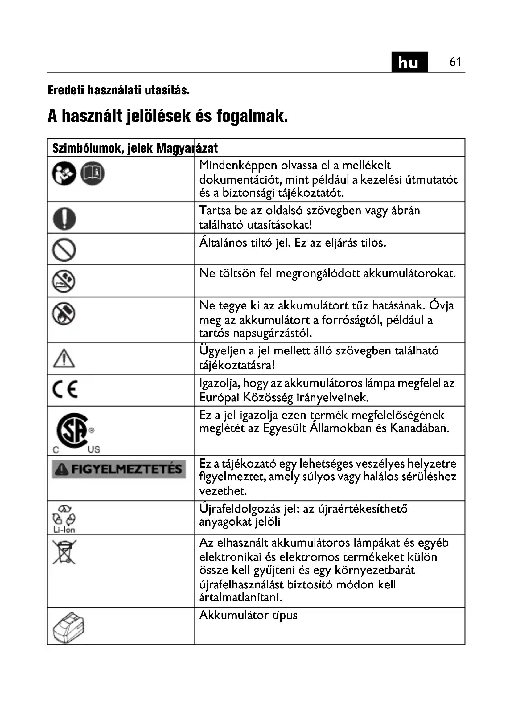 Eredeti használati utasítás. A használt jelölések és fogalmak. Szimbólumok, jelek Magyarázat Mindenképpen olvassa el a mellékelt dokumentációt, mint például a kezelési útmutatót és a biztonsági tájékoztatót. Tartsa be az oldalsó szövegben vagy ábrán található utasításokat! Általános tiltó jel. Ez az eljárás tilos. Ne töltsön fel megrongálódott akkumulátorokat. Ne tegye ki az akkumulátort tűz hatásának. Óvja meg az akkumulátort a forróságtól, például a tartós napsugárzástól. Ügyeljen a jel mellett álló szövegben található tájékoztatásra! Igazolja, hogy az akkumulátoros lámpa megfelel az Európai Közösség irányelveinek. Ez a jel igazolja ezen termék megfelelőségének meglétét az Egyesült Államokban és Kanadában. Ez a tájékozató egy lehetséges veszélyes helyzetre figyelmeztet, amely súlyos vagy halálos sérüléshez vezethet. Újrafeldolgozás jel: az újraértékesíthető anyagokat jelöli Az elhasznált akkumulátoros lámpákat és egyéb elektronikai és elektromos termékeket külön össze kell gyűjteni és egy környezetbarát újrafelhasználást biztosító módon kell ártalmatlanítani. Akkumulátor típus OBJ_BUCH-0000000215-001.book Page 61 Friday, August 7, 2015 9:31 AM62