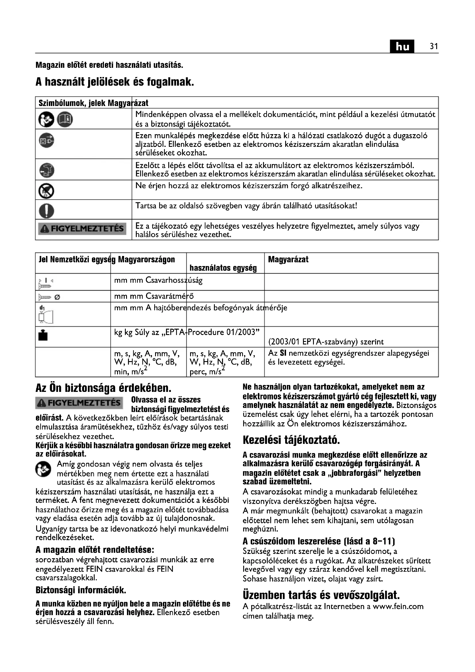 kéziszerszám hasznalati utasításat, ne használja ezta terméket. A fent megnevezett dokumentációt a késöbbi hasznalathoz orizze meg és a magazin elotét továbadásá vagy eladása esétén adja tovább az útulajdonosnak.