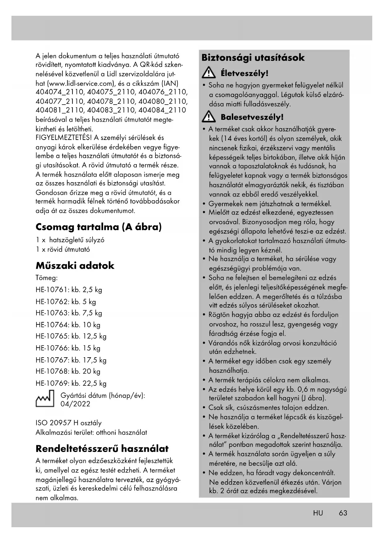 Importante: accertarsi che le cosce resti- no parallele tra loro e vicine. Portare in avanti il bacino, il busto resta dritto.62 Conservazione, pulizia In caso di mancato utilizzo, riporre l’articolo a temperatura ambiente in un luogo asciutto e pulito. Pulire solo con un panno umido e quindi asciu- gare. IMPORTANTE! Non utilizzare mai detergenti aggressivi. IT63HU A jelen dokumentum a teljes használati útmutató rövidített, nyomtatott kiadványa. A QR-kód szken- nelésével közvetlenül a Lidl szervizoldalára jut- hat (www.lidl-service.com), és a cikkszám (IAN) 404074_2110, 404075_2110, 404076_2110, 404077_2110, 404078_2110, 404080_2110, 404081_2110, 404083_2110, 404084_2110 beírásával a teljes használati útmutatót megte- kintheti és letöltheti. FIGYELMEZTETÉS! A személyi sérülések és anyagi károk elkerülése érdekében vegye figye- lembe a teljes használati útmutatót és a biztonsá- gi utasításokat. A rövid útmutató a termék része. A termék használata előtt alaposan ismerje meg az összes használati és biztonsági utasítást. Gondosan őrizze meg a rövid útmutatót, és a termék harmadik félnek történő továbbadásakor adja át az összes dokumentumot. Csomag tartalma (A ábra) 1 x hatszögletű súlyzó 1 x rövid útmutató Műszaki adatok Tömeg: HE-10761: kb. 2,5 kg HE-10762: kb. 5 kg HE-10763: kb. 7,5 kg HE-10764: kb. 10 kg HE-10765: kb. 12,5 kg HE-10766: kb. 15 kg HE-10767: kb. 17,5 kg HE-10768: kb. 20 kg HE-10769: kb. 22,5 kg Gyártási dátum (hónap/év): 04/2022 ISO 20957 H osztály Alkalmazási terület: otthoni használat Rendeltetésszerű használat A terméket olyan edzőeszközként fejlesztettük ki, amellyel az egész testét edzheti. A terméket magánjellegű használatra tervezték, az gyógyá- szati, üzleti és kereskedelmi célú felhasználásra nem alkalmas. Biztonsági utasítások Életveszély!