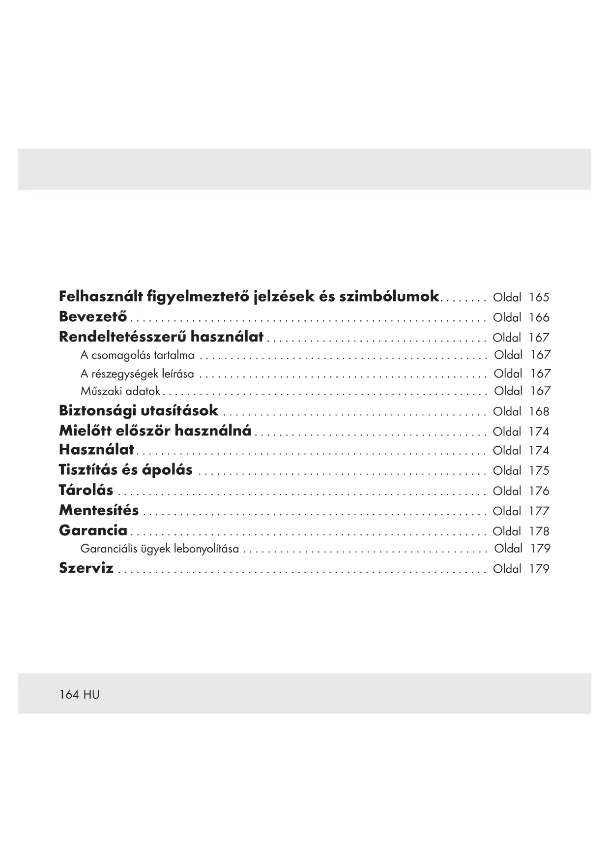 Felhasznált figyelmeztető jelzések és szimbólumok...... . . Oldal 165 Bevezető ........................................................ . . Oldal 166 Rendeltetésszerű használat .................................. . . Oldal 167 A csomagolás tartalma ............................................. . . Oldal 167 A részegységek leírása ............................................. . . Oldal 167 Műszaki adatok ................................................... . . Oldal 167 Biztonsági utasítások ......................................... . . Oldal 168 Mielőtt először használná .................................... . . Oldal 174 Használat....................................................... . . Oldal 174 Tisztítás és ápolás ............................................. . . Oldal 175 Tárolás .......................................................... . . Oldal 176 Mentesítés ...................................................... . . Oldal 177 Garancia ........................................................ . . Oldal 178 Garanciális ügyek lebonyolítása ...................................... . . Oldal 179 Szerviz .......................................................... . . Oldal 179165