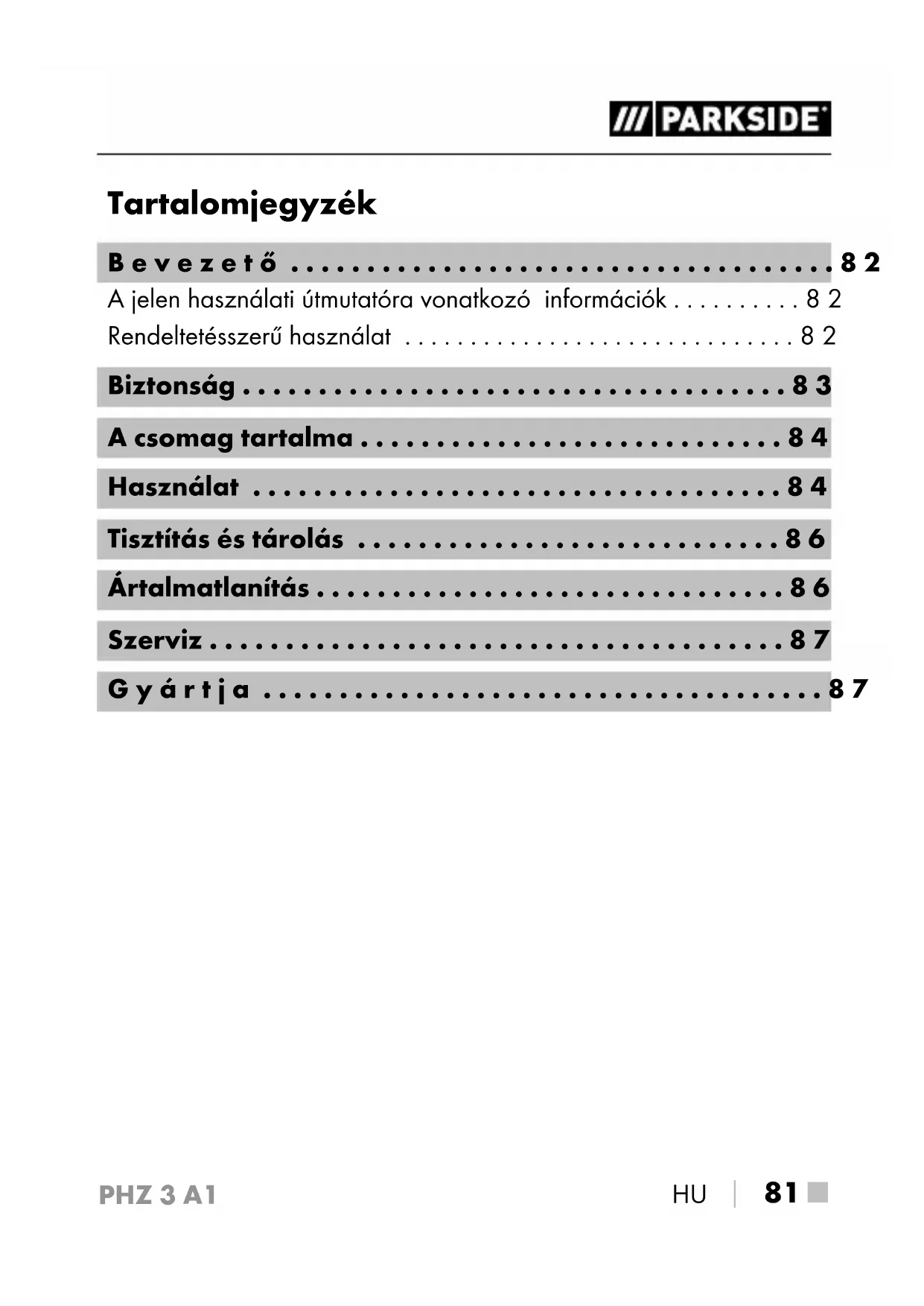 HASZNÁLATI ÚTMUTATÓ PHZ 3 A1 PARKSIDE