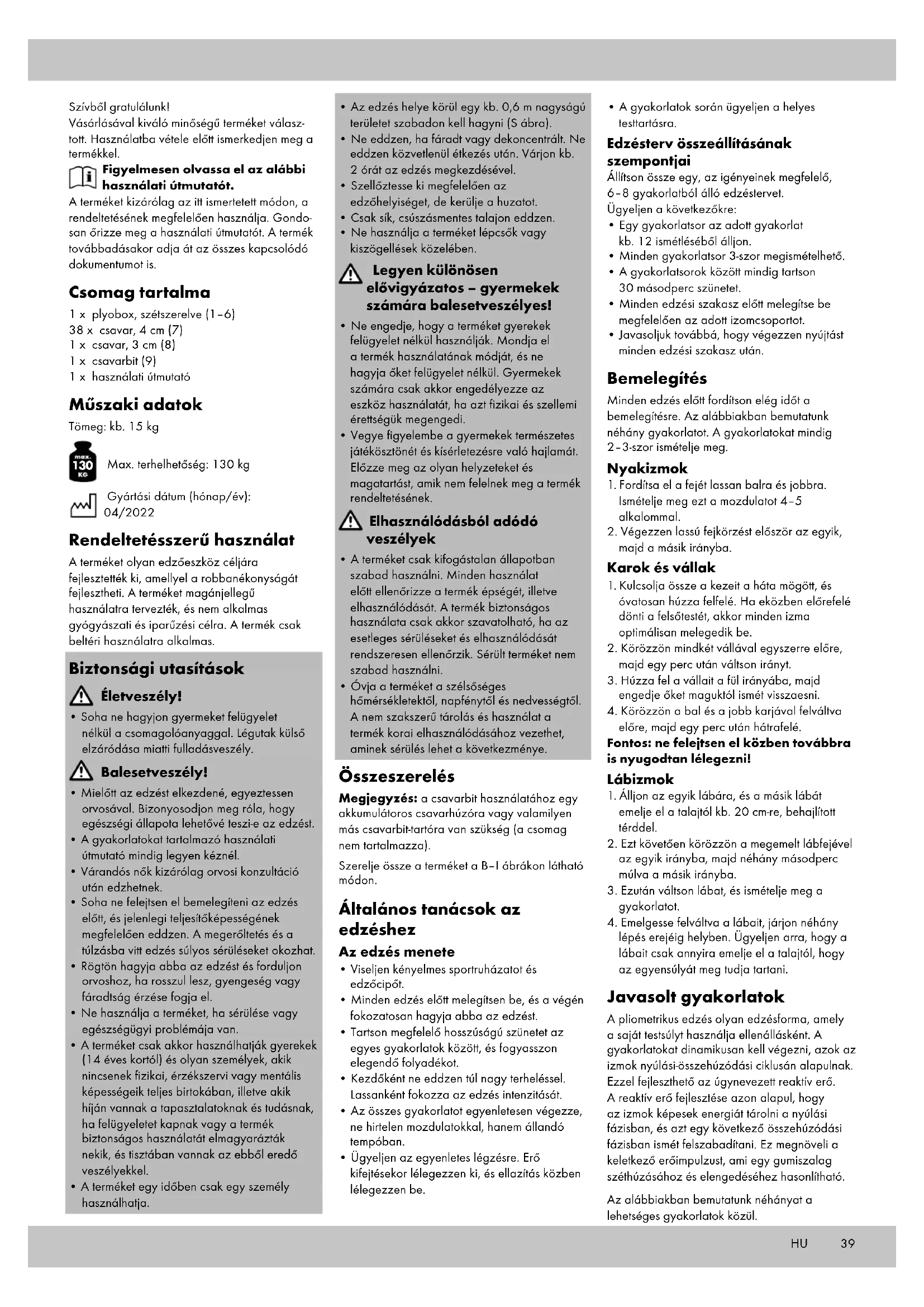 Max. terhelhetőség: 130 kg Gyártási dátum (hónap/év): 04/2022 Rendeltetésszerű használat A terméket olyan edzőeszköz céljára fejlesztették ki, amellyel a robbanékonyságát fejlesztheti. A terméket magánjellegű használatra tervezték, és nem alkalmas gyógyászati és iparűzési célra. A termék csak beltéri használatra alkalmas. Biztonsági utasítások Életveszély!
