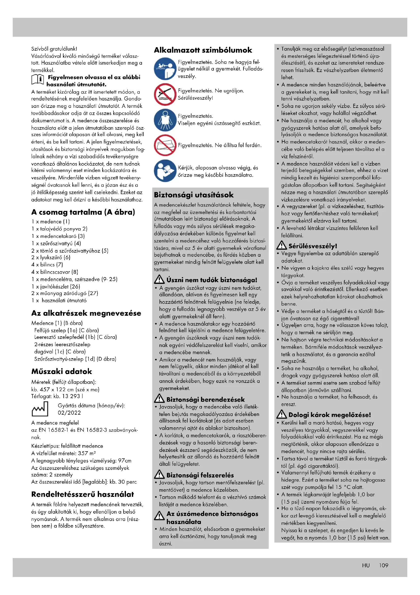 - Rivolgersi ad uno specialista. Smaltimento Una volta che l’articolo diventa inutilizzabile, non gettarlo nei rifiuti domestici, ma smaltirlo correttamente nel pieno rispetto dell’ambiente. È possibile ottenere informazioni sui punti di raccolta e sui loro orari di apertura presso l’ufficio amministra- tivo competente. Smaltire l’articolo e il materiale di imballaggio nel pieno rispetto dell’am- biente. Si noti la marcatura dei materiali di imballaggio durante la separazione dei rifiuti, questi sono contrassegnati da abbreviazioni (a) e numeri (b) con il seguente significato: 1-7: materiali plastici/20-22: carta e cartone/80-98: materiali compositi. L’articolo e i materiali di imballaggio sono rici- clabili, smaltirli separatamente per una migliore gestione dei rifiuti. Il logo Triman è valido solo per la Francia. Per informazioni su come smaltire l’articolo non più utilizzabile, rivolgersi alle autorità locali o comunali.109 Szívből gratulálunk! Vásárlásával kiváló minőségű terméket válasz- tott. Használatba vétele előtt ismerkedjen meg a termékkel. Figyelmesen olvassa el az alábbi használati útmutatót. A terméket kizárólag az itt ismertetett módon, a rendeltetésének megfelelően használja. Gondo- san őrizze meg a használati útmutatót. A termék továbbadásakor adja át az összes kapcsolódó dokumentumot is. A medence összeszerelése és használata előtt a jelen útmutatóban szereplő ösz- szes információt alaposan át kell olvasni, meg kell érteni, és be kell tartani. A jelen figyelmeztetések, utasítások és biztonsági irányelvek magukban fog- lalnak néhány a vízi szabadidős tevékenységre vonatkozó általános kockázatot, de nem tudnak kitérni valamennyi eset minden kockázatára és veszélyére. Mindenféle vízben végzett tevékeny- ségnél óvatosnak kell lenni, és a józan ész és a jó ítélőképesség szerint kell cselekedni. Ezeket az adatokat meg kell őrizni a későbbi használathoz. A csomag tartalma (A ábra) 1 x medence (1) 1 x talajvédő ponyva 2) 1 x medencetakaró (3) 1 x szűrőszivattyú (4) 2 x tömlő a szűrőszivattyúhoz (5) 2 x lyukszűrő (6) 4 x bilincs (7) 4 x bilincscsavar (8) 1 x medencelétra, szétszedve (9- 25) 1 x javítókészlet (26) 2 x műanyag záródugó (27) 1 x használati útmutató Az alkatrészek megnevezése Medence (1) (B ábra) Felfújó szelep (1a) (C ábra) Leeresztő szelepfedél (1b) (C ábra) 2-részes leeresztőszelep dugóval (1c) (C ábra) Szűrőszivattyú-szelep (1d) (D ábra) Műszaki adatok Méretek (felfújt állapotban): kb. 457 x 122 cm (szé x ma) Térfogat: kb. 13 293 l Gyártás dátuma (hónap/év): 02/2022 A medence megfelel az EN 16582-1 és EN 16582-3 szabványok- nak. Készlettípus: felállított medence A vízfelület méretei: 357 m² A legnagyobb tényleges vízmélység: 97cm Az összeszereléshez szükséges személyek száma: 2 személy Az összeszerelési idő [legalább]: kb. 30 perc Rendeltetésszerű használat A termék földre helyezett medencének tervezték, és úgy alakították ki, hogy ellenálljon a belső nyomásnak. A termék nem alkalmas arra (rész- ben sem) a földbe süllyesztésre. Alkalmazott szimbólumok Figyelmeztetés. Soha ne hagyja fel- ügyelet nélkül a gyermekét. Fulladás- veszély. Figyelmeztetés. Ne ugráljon. Sérülésveszély! Figyelmeztetés. Viseljen egyéni úszássegítő eszközt. Figyelmeztetés. Ne állítsa fel ferdén. Kérjük, alaposan olvassa végig, és őrizze meg későbbi használatra. Biztonsági utasítások A medencekészlet használatának feltétele, hogy az megfelel az üzemeltetési és karbantartási útmutatóban leírt biztonsági előírásoknak. A fulladás vagy más súlyos sérülések megaka- dályozása érdekében különös figyelmet kell szentelni a medencéhez való hozzáférés biztosí- tására, mivel az 5 év alatti gyermekek váratlanul bejuthatnak a medencébe, és fürdés közben a gyermekeket mindig felnőtt felügyelete alatt kell tartani. Úszni nem tudók biztonsága!