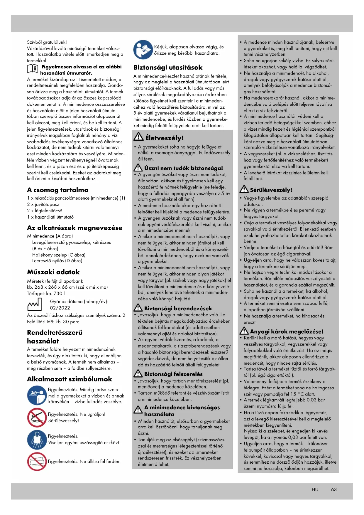 - A gyermekeket soha ne hagyja felügyelet nélkül a csomagolóanyaggal. Fulladásveszély áll fenn. Úszni nem tudók biztonsága!