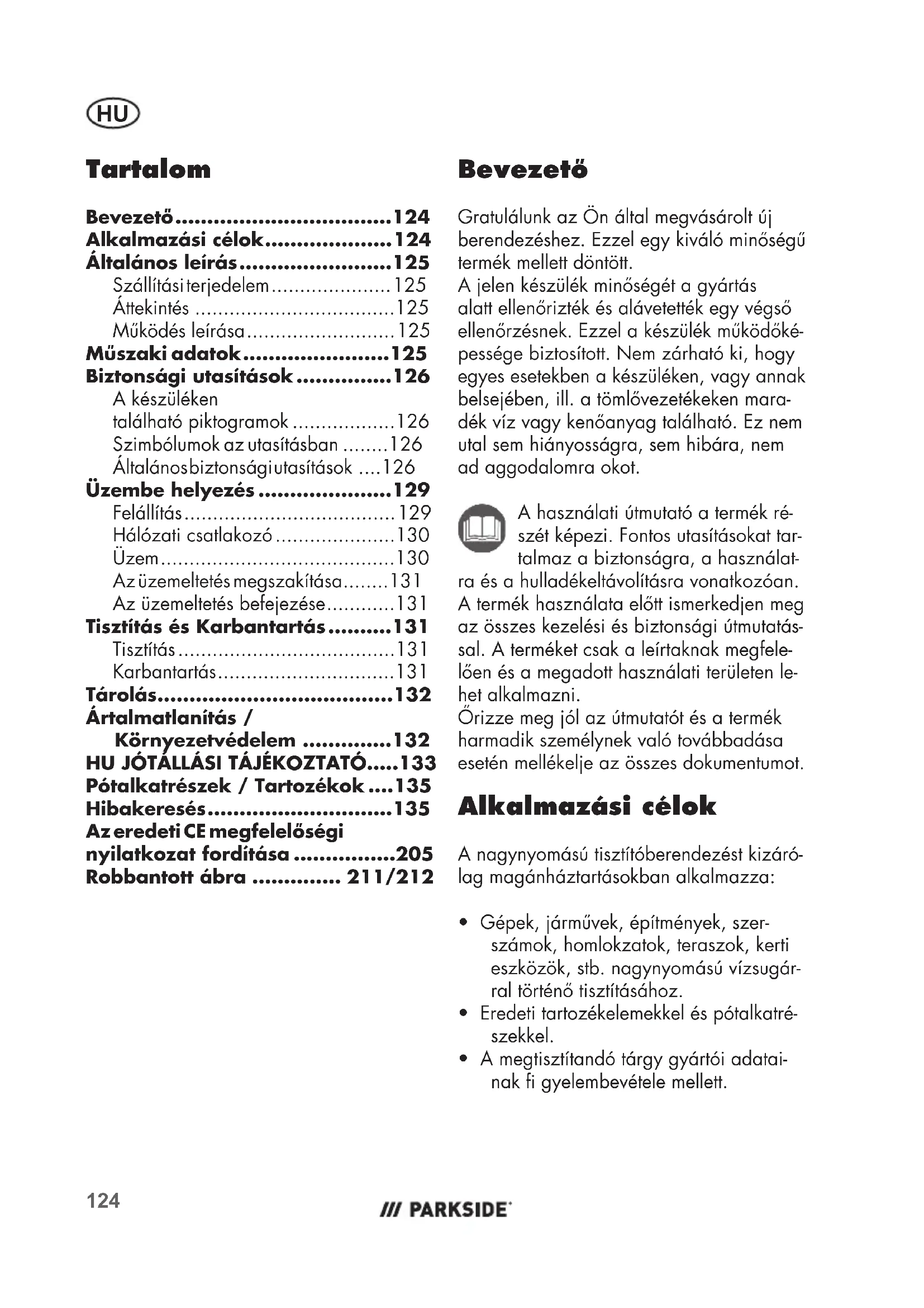 Bevezető Gratulálunk az Ön által megvásárolt új berendezéshez. Ezzel egy kiváló minőségű termék mellett döntött. A jelen készülék minőségét a gyártás alatt ellenőrizték és alávetették egy végső ellenőrzésnek. Ezzel a készülék működőké- pessége biztosított. Nem zárható ki, hogy egyes esetekben a készüléken, vagy annak belsejében, ill. a tömlővezetékeken mara- dék víz vagy kenőanyag található. Ez nem utal sem hiányosságra, sem hibára, nem ad aggodalomra okot. A használati útmutató a termék ré- szét képezi. Fontos utasításokat tar- talmaz a biztonságra, a használat- ra és a hulladékeltávolításra vonatkozóan. A termék használata előtt ismerkedjen meg az összes kezelési és biztonsági útmutatás- sal. A terméket csak a leírtaknak megfele- lően és a megadott használati területen le- het alkalmazni. Őrizze meg jól az útmutatót és a termék harmadik személynek való továbbadása esetén mellékelje az összes dokumentumot. Alkalmazási célok A nagynyomású tisztítóberendezést kizáró- lag magánháztartásokban alkalmazza: