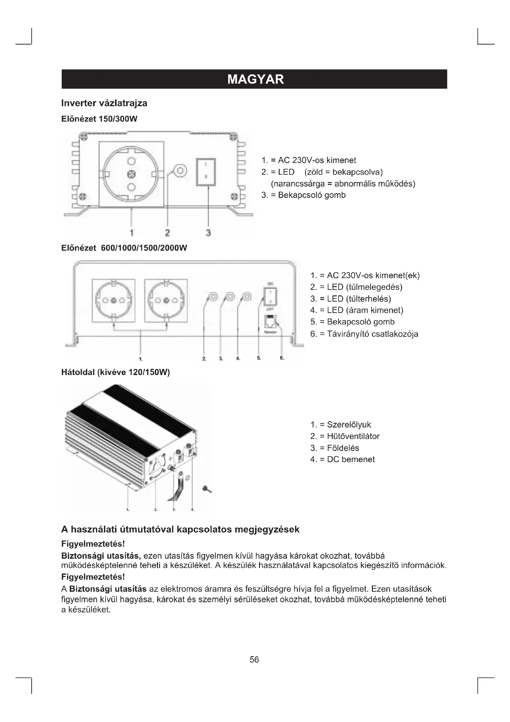 NO ABRIR ATENCIÓN56 MAGYAR Inverter vázlatrajza Előnézet 150/300W 1.=AC230V-oskimenet 2.=LED (zöld=bekapcsolva) (narancssárga=abnormálisműködés)