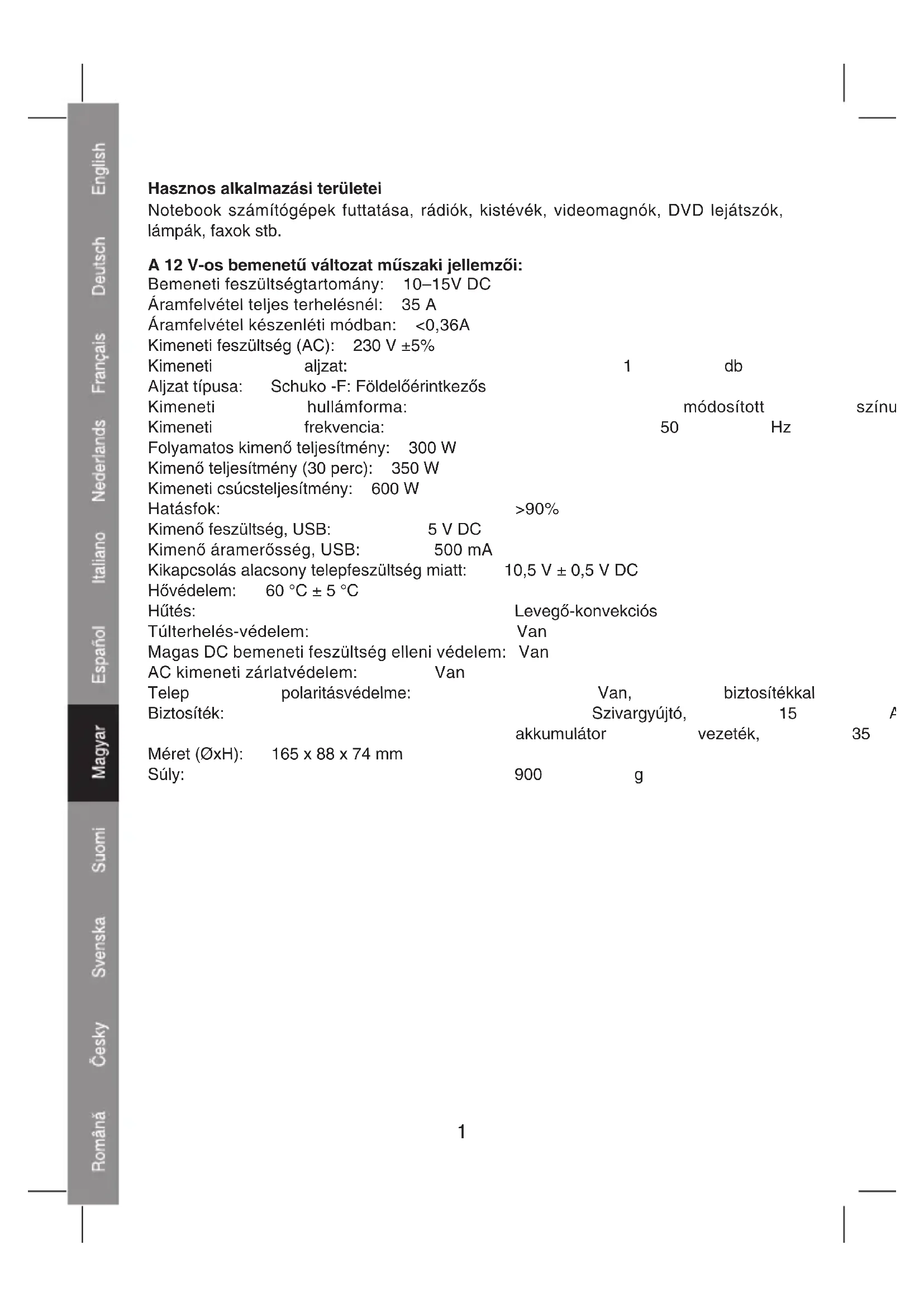 KIMENETTELHasznos alkalmazási területei Notebook számítógépek futtatása, rádiók, kistévék, videomagnók, DVD lejátszók, lámpák, faxok stb. A 12 V-os bemenetű változat műszaki jellemzői: Bemeneti feszültségtartomány: 10–15V DC Áramfelvétel teljes terhelésnél: 35 A Áramfelvétel készenléti módban: <0,36A Kimeneti feszültség (AC): 230 V ±5% Kimeneti aljzat: 1 db Aljzat típusa: Schuko -F: Földelőérintkezős Kimeneti hullámforma: módosított színuszhullám Kimeneti frekvencia: 50 Hz Folyamatos kimenő teljesítmény: 300 W Kimenő teljesítmény (30 perc): 350 W Kimeneti csúcsteljesítmény: 600 W Hatásfok: >90% Kimenő feszültség, USB: 5 V DC Kimenő áramerősség, USB: 500 mA Kikapcsolás alacsony telepfeszültség miatt: 10,5 V ± 0,5 V DC Hővédelem: 60 °C ± 5 °C Hűtés: Levegő-konvekciós Túlterhelés-védelem: Van Magas DC bemeneti feszültség elleni védelem: Van AC kimeneti zárlatvédelem: Van Telep polaritásvédelme: Van, biztosítékkal Biztosíték: Szivargyújtó, 15 A, akkumulátor vezeték, 35 A Méret (ØxH): 165 x 88 x 74 mm Súly: 900 g 1A 24 V-os bemenetű változat műszaki adatai Bemeneti feszültségtartomány: 20–30 V DC Áramfelvétel teljes terhelésnél: 15 A Áramfelvétel készenléti módban: <0,2 A Kimeneti feszültség (AC): 230 V ± 5% Kimeneti aljzat: 1 db Aljzat típusa: Schuko (-F: Földelőérintkezős) Kimeneti hullámforma: tiszta színuszhullám Kimeneti frekvencia: 50 Hz Folyamatos kimenő teljesítmény: 300 W Kimenő teljesítmény (30 perc): 350 W Kimenő csúcsteljesítmény: 600 W Hatásfok: >90% Kimenő feszültség, USB: 5 V DC Kimenő áramerősség, USB: 500 mA Kikapcsolás alacsony telepfeszültség miatt: 21 V ± 0,8 V DC Hővédelem: 60 °C ± 5 °C Hűtés: Levegő-konvekciós Túlterhelés-védelem: Van Magas DC bemeneti feszültség elleni védelem: Van AC kimeneti zárlatvédelem: Van Telep polaritásvédelme: Van, biztosítékkal Biztosíték: Szivargyújtó, 10 A, akkumulátor vezeték, 20 A Méret (ØxH): 165 x 88 x 74 mm Súly: 900g 2Kezelési útmutató: