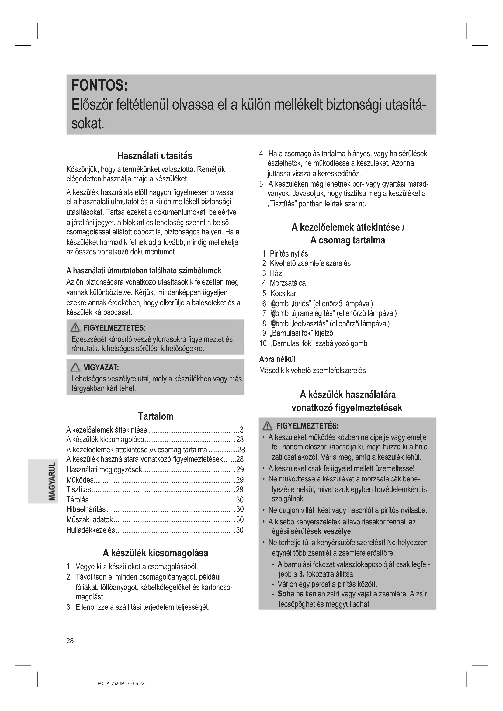 - Ne terhelje túl a kenyérsütőfelszerelést! Ne helyezzen egynél több zsemlét a zsemlefelerősítőre! - A barnulási fokozat választókapcsolóját csak legfel- jebb a 3. fokozatra állítsa. - Várjon egy percet a pirítás között. - Soha ne kenjen zsírt vagy vajat a zsemlére. A zsír lecsöpöghet és meggyulladhat!PC-TA1252_IM 30.06.22