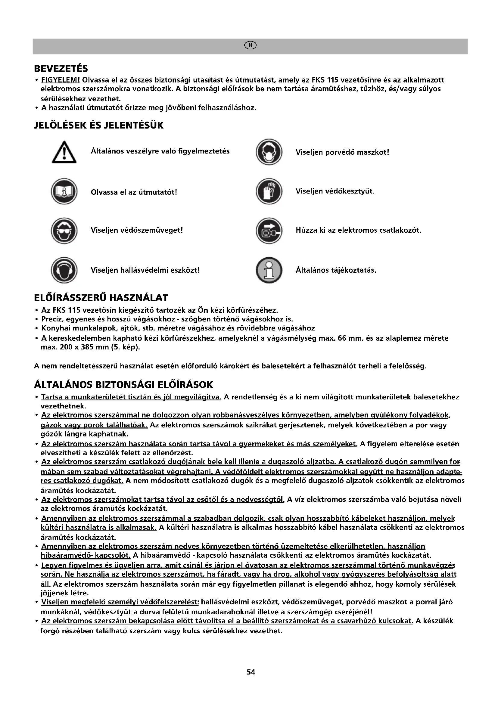 - FIGYELEM! Olvassa el az összes biztonsági utasítást és útmutatást, amely az FKS 115 vezetősínre és az alkalmazott elektromos szerszámokra vonatkozik. A biztonsági előírások be nem tartása áramütéshez, tűzhöz, és/vagy súlyos sérülésekhez vezethet.