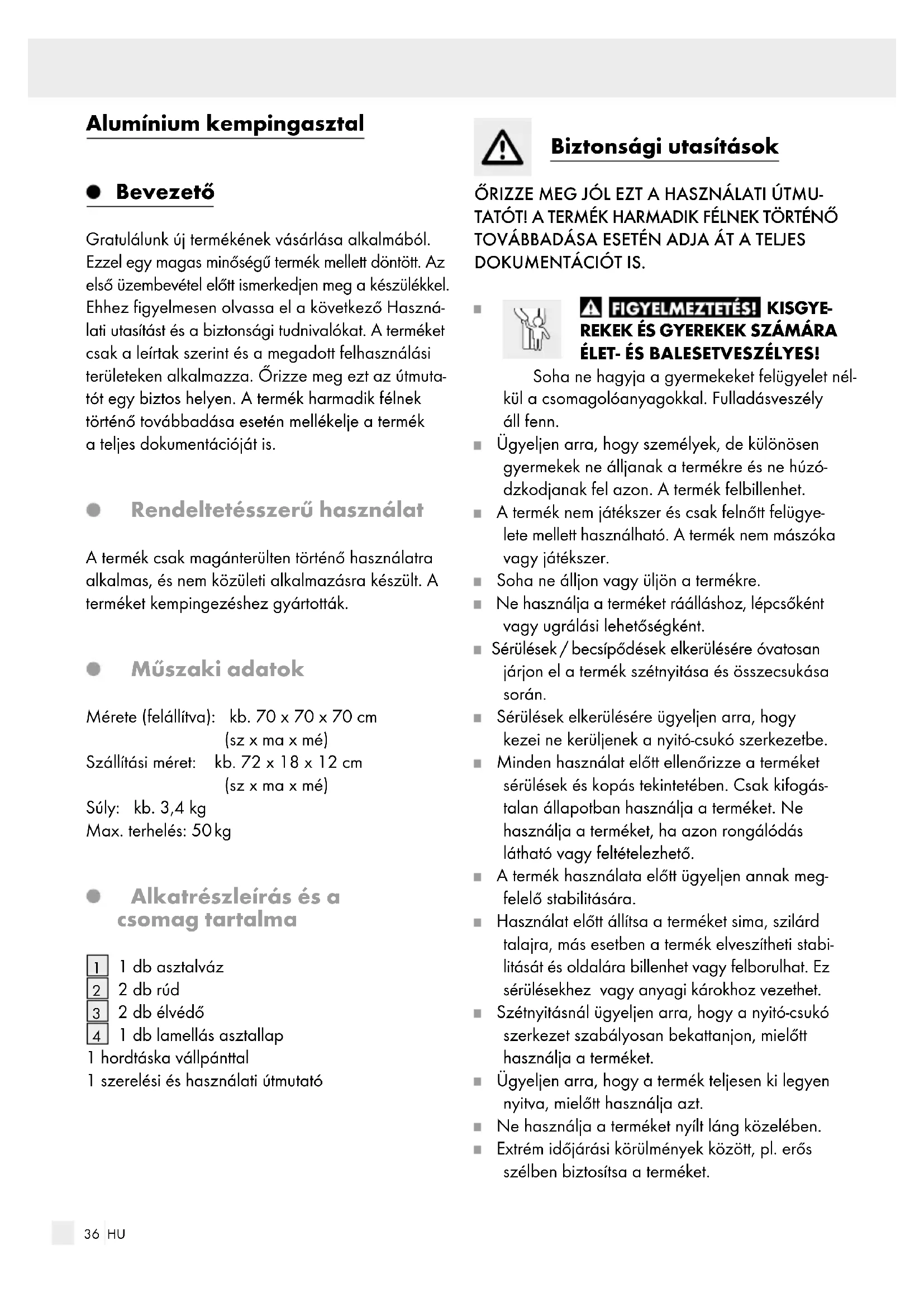 1 db lamellás asztallap 1 hordtáska vállpánttal 1 szerelési és használati útmutató Biztonsági utasítások ŐRIZZE MEG JÓL EZT A HASZNÁLATI ÚTMU- TATÓT! A TERMÉK HARMADIK FÉLNEK TÖRTÉNŐ TOVÁBBADÁSA ESETÉN ADJA ÁT A TELJES DOKUMENTÁCIÓT IS. KISGYE-