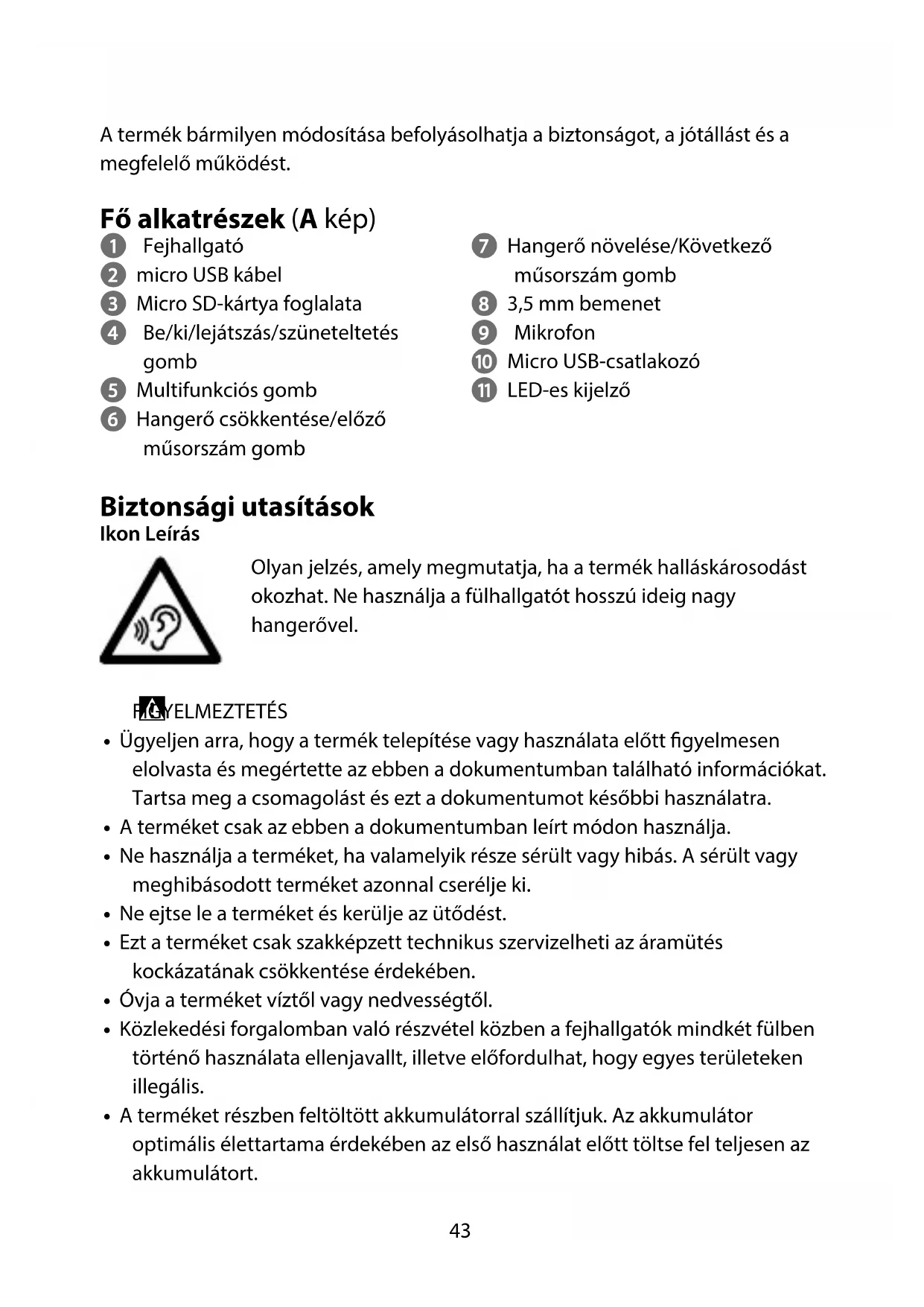 - Közlekedési forgalomban való részvétel közben a fejhallgatók mindkét fülben történő használata ellenjavallt, illetve előfordulhat, hogy egyes területeken illegális.
