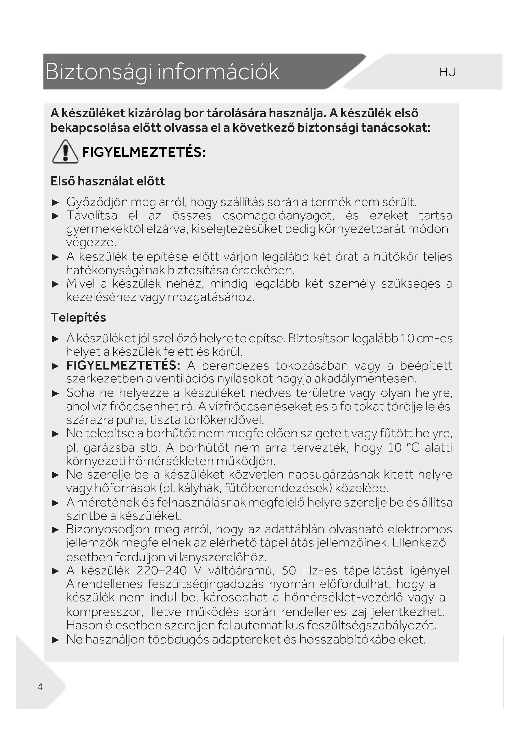 A készüléket kizárólag bor tárolására használja. A készülék első bekapcsolása előtt olvassa el a következő biztonsági tanácsokat: FIGYELMEZTETÉS: Első használat előtt ► Győződjön meg arról, hogy szállítás során a termék nem sérült. ► Távolítsa el az összes csomagolóanyagot, és ezeket tartsa gyermekektől elzárva, kiselejtezésüket pedig környezetbarát módon végezze. ► A készülék telepítése előtt várjon legalább két órát a hűtőkör teljes hatékonyságának biztosítása érdekében. ► Mivel a készülék nehéz, mindig legalább két személy szükséges a kezeléséhez vagy mozgatásához. Telepítés ► A készüléket jól szellőző helyre telepítse. Biztosítson legalább 10 cm-es helyet a készülék felett és körül. ► FIGYELMEZTETÉS: A berendezés tokozásában vagy a beépített szerkezetben a ventilációs nyílásokat hagyja akadálymentesen. ► Soha ne helyezze a készüléket nedves területre vagy olyan helyre, ahol víz fröccsenhet rá. A vízfröccsenéseket és a foltokat törölje le és szárazra puha, tiszta törlőkendővel. ► Ne telepítse a borhűtőt nem megfelelően szigetelt vagy fűtött helyre, pl. garázsba stb. A borhűtőt nem arra tervezték, hogy 10 °C alatti környezeti hőmérsékleten működjön. ► Ne szerelje be a készüléket közvetlen napsugárzásnak kitett helyre vagy hőforrások (pl. kályhák, fűtőberendezések) közelébe. ► A méretének és felhasználásnak megfelelő helyre szerelje be és állítsa szintbe a készüléket. ► Bizonyosodjon meg arról, hogy az adattáblán olvasható elektromos jellemzők megfelelnek az elérhető tápellátás jellemzőinek. Ellenkező esetben forduljon villanyszerelőhöz. ► A készülék 220–240 V váltóáramú, 50 Hz-es tápellátást igényel. A rendellenes feszültségingadozás nyomán előfordulhat, hogy a készülék nem indul be, károsodhat a hőmérséklet-vezérlő vagy a kompresszor, illetve működés során rendellenes zaj jelentkezhet. Hasonló esetben szereljen fel automatikus feszültségszabályozót. ► Ne használjon többdugós adaptereket és hosszabbítókábeleket.HU Biztonsági információk