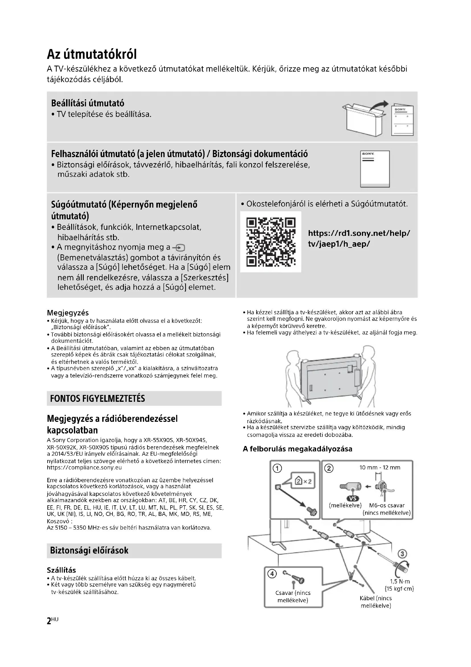 - Kérjük, hogy a tv használata előtt olvassa el a következőt: „Biztonsági előírások”.• További biztonsági előírásokért olvassa el a mellékelt biztonsági dokumentációt. • A Beállítási útmutatóban, valamint az ebben az útmutatóban szereplő képek és ábrák csak tájékoztatási célokat szolgálnak, és eltérhetnek a valós terméktől.• A típusnévben szereplő „x”/„xx” a kialakításra, a színváltozatra vagy a televízió-rendszerre vonatkozó számjegynek felel meg. Megjegyzés a rádióberendezéssel kapcsolatban A Sony Corporation igazolja, hogy a XR-55X90S, XR-50X94S, XR-50X92K, XR-50X90S típusú rádiós berendezések megfelelnek a 2014/53/EU irányelv előírásainak. Az EU-megfelelőségi nyilatkozat teljes szövege elérhető a következő internetes címen: https://compliance.sony.euErre a rádióberendezésre vonatkozóan az üzembe helyezéssel kapcsolatos következő korlátozások, vagy a használat jóváhagyásával kapcsolatos következő követelmények alkalmazandók ezekben az országokban: AT, BE, HR, CY, CZ, DK, EE, FI, FR, DE, EL, HU, IE, IT, LV, LT, LU, MT, NL, PL, PT, SK, SI, ES, SE, UK, UK (NI), IS, LI, NO, CH, BG, RO, TR, AL, BA, MK, MD, RS, ME, Koszovó :Az 5150 – 5350 MHz-es sáv beltéri használatra van korlátozva. Szállítás