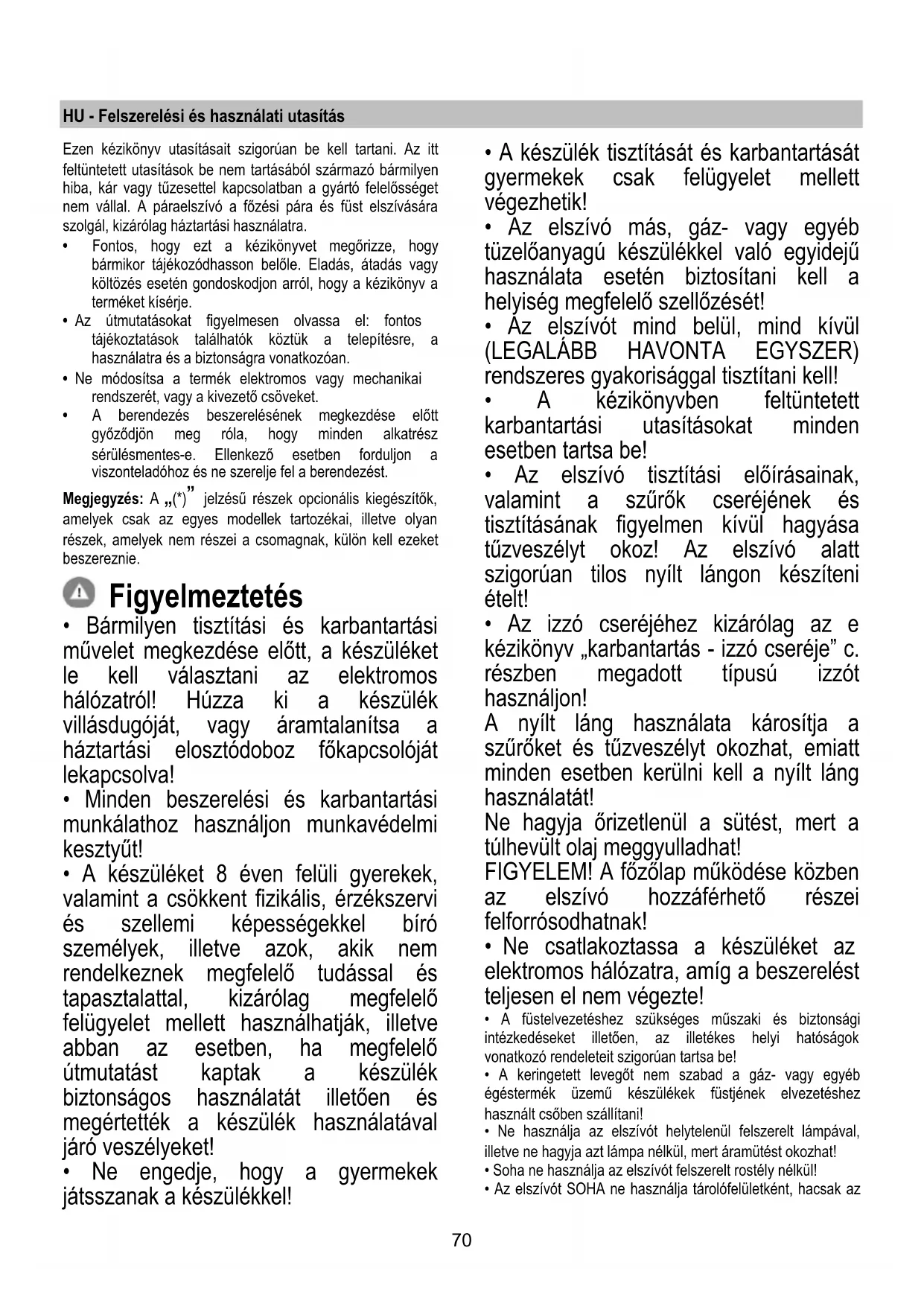 - Az izzó cseréjéhez kizárólag az e kézikönyv „karbantartás - izzó cseréje” c. részben megadott típusú izzót használjon! A nyílt láng használata károsítja a szűrőket és tűzveszélyt okozhat, emiatt minden esetben kerülni kell a nyílt láng használatát! Ne hagyja őrizetlenül a sütést, mert a túlhevült olaj meggyulladhat! FIGYELEM! A főzőlap működése közben az elszívó hozzáférhető részei felforrósodhatnak!