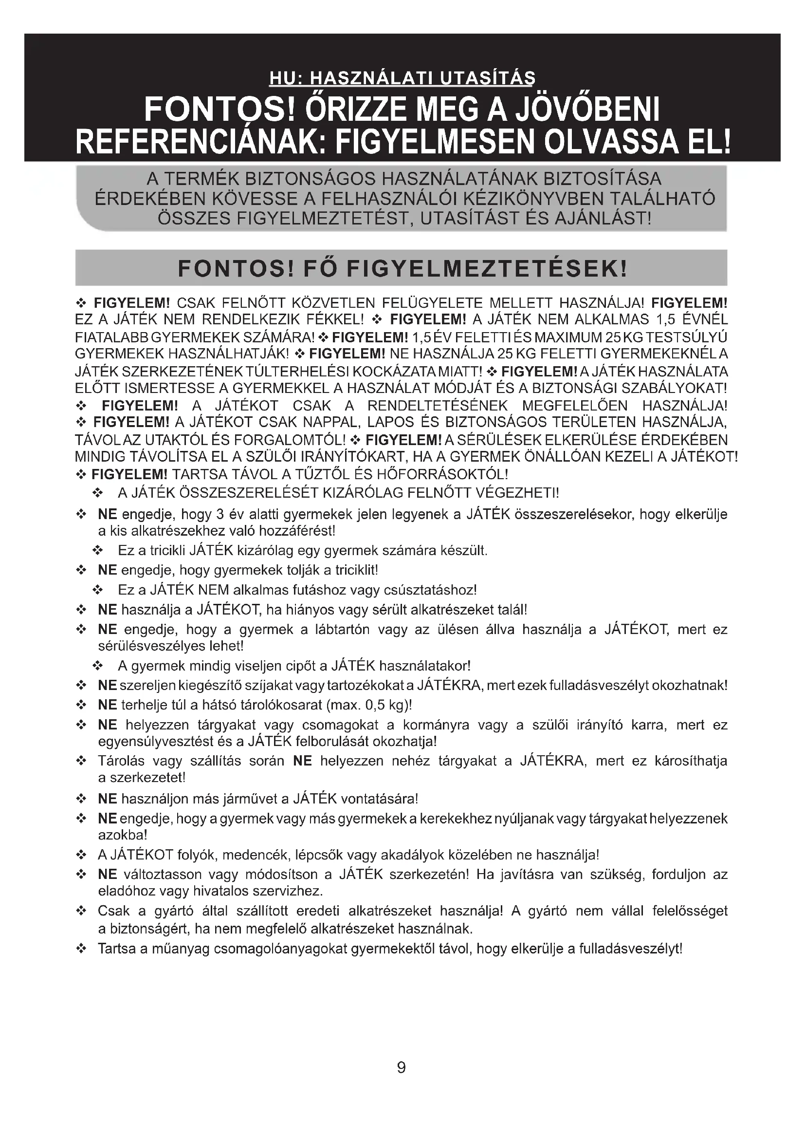 FONTOS! ŐRIZZE MEG A JÖVŐBENI REFERENCIÁNAK: FIGYELMESEN OLVASSA EL! FONTOS! FŐ FIGYELMEZTETÉSEK! FIGYELEM! CSAK FELNŐTT KÖZVETLEN FELÜGYELETE MELLETT HASZNÁLJA! FIGYELEM! EZ A JÁTÉK NEM RENDELKEZIK FÉKKEL! FIGYELEM! A JÁTÉK NEM ALKALMAS 1,5 ÉVNÉL FIATALABB GYERMEKEK SZÁMÁRA! FIGYELEM! 1,5 ÉV FELETTI ÉS MAXIMUM 25 KG TESTSÚLYÚ GYERMEKEK HASZNÁLHATJÁK! FIGYELEM! NE HASZNÁLJA 25 KG FELETTI GYERMEKEKNÉL A JÁTÉK SZERKEZETÉNEK TÚLTERHELÉSI KOCKÁZATA MIATT! FIGYELEM! A JÁTÉK HASZNÁLATA ELŐTT ISMERTESSE A GYERMEKKEL A HASZNÁLAT MÓDJÁT ÉS A BIZTONSÁGI SZABÁLYOKAT! FIGYELEM! A JÁTÉKOT CSAK A RENDELTETÉSÉNEK MEGFELELŐEN HASZNÁLJA! FIGYELEM! A JÁTÉKOT CSAK NAPPAL, LAPOS ÉS BIZTONSÁGOS TERÜLETEN HASZNÁLJA, TÁVOL AZ UTAKTÓL ÉS FORGALOMTÓL! FIGYELEM! A SÉRÜLÉSEK ELKERÜLÉSE ÉRDEKÉBEN MINDIG TÁVOLÍTSA EL A SZÜLŐI IRÁNYÍTÓKART, HA A GYERMEK ÖNÁLLÓAN KEZELI A JÁTÉKOT! FIGYELEM! TARTSA TÁVOL A TŰZTŐL ÉS HŐFORRÁSOKTÓL! A JÁTÉK ÖSSZESZERELÉSÉT KIZÁRÓLAG FELNŐTT VÉGEZHETI! NE engedje, hogy 3 év alatti gyermekek jelen legyenek a JÁTÉK összeszerelésekor, hogy elkerülje a kis alkatrészekhez való hozzáférést! Ez a tricikli JÁTÉK kizárólag egy gyermek számára készült. NE engedje, hogy gyermekek tolják a triciklit! Ez a JÁTÉK NEM alkalmas futáshoz vagy csúsztatáshoz! NE használja a JÁTÉKOT, ha hiányos vagy sérült alkatrészeket talál! NE engedje, hogy a gyermek a lábtartón vagy az ülésen állva használja a JÁTÉKOT, mert ez sérülésveszélyes lehet! A gyermek mindig viseljen cipőt a JÁTÉK használatakor! NE szereljen kiegészítő szíjakat vagy tartozékokat a JÁTÉKRA, mert ezek fulladásveszélyt okozhatnak! NE terhelje túl a hátsó tárolókosarat (max. 0,5 kg)! NE helyezzen tárgyakat vagy csomagokat a kormányra vagy a szülői irányító karra, mert ez egyensúlyvesztést és a JÁTÉK felborulását okozhatja! Tárolás vagy szállítás során NE helyezzen nehéz tárgyakat a JÁTÉKRA, mert ez károsíthatja a szerkezetet! NE használjon más járművet a JÁTÉK vontatására! NE engedje, hogy a gyermek vagy más gyermekek a kerekekhez nyúljanak vagy tárgyakat helyezzenek azokba! A JÁTÉKOT folyók, medencék, lépcsők vagy akadályok közelében ne használja! NE változtasson vagy módosítson a JÁTÉK szerkezetén! Ha javításra van szükség, forduljon az eladóhoz vagy hivatalos szervizhez. Csak a gyártó által szállított eredeti alkatrészeket használja! A gyártó nem vállal felelősséget a biztonságért, ha nem megfelelő alkatrészeket használnak. Tartsa a műanyag csomagolóanyagokat gyermekektől távol, hogy elkerülje a fulladásveszélyt!