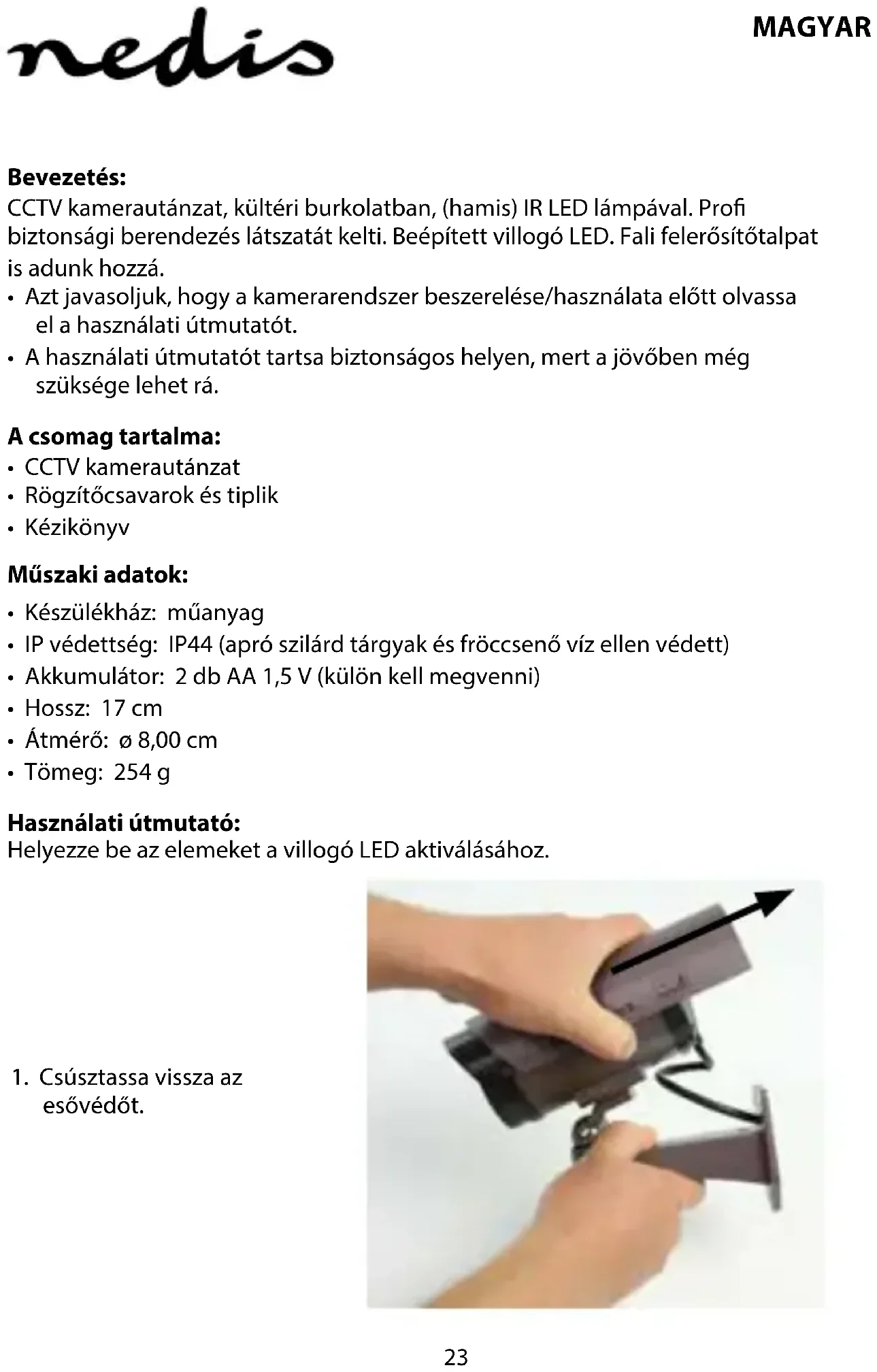 Bevezetés: CCTV kamerautánzat, kültéri burkolatban, (hamis) IR LED lámpával. Pro biztonsági berendezés látszatát kelti. Beépített villogó LED. Fali felerősítőtalpat is adunk hozzá.