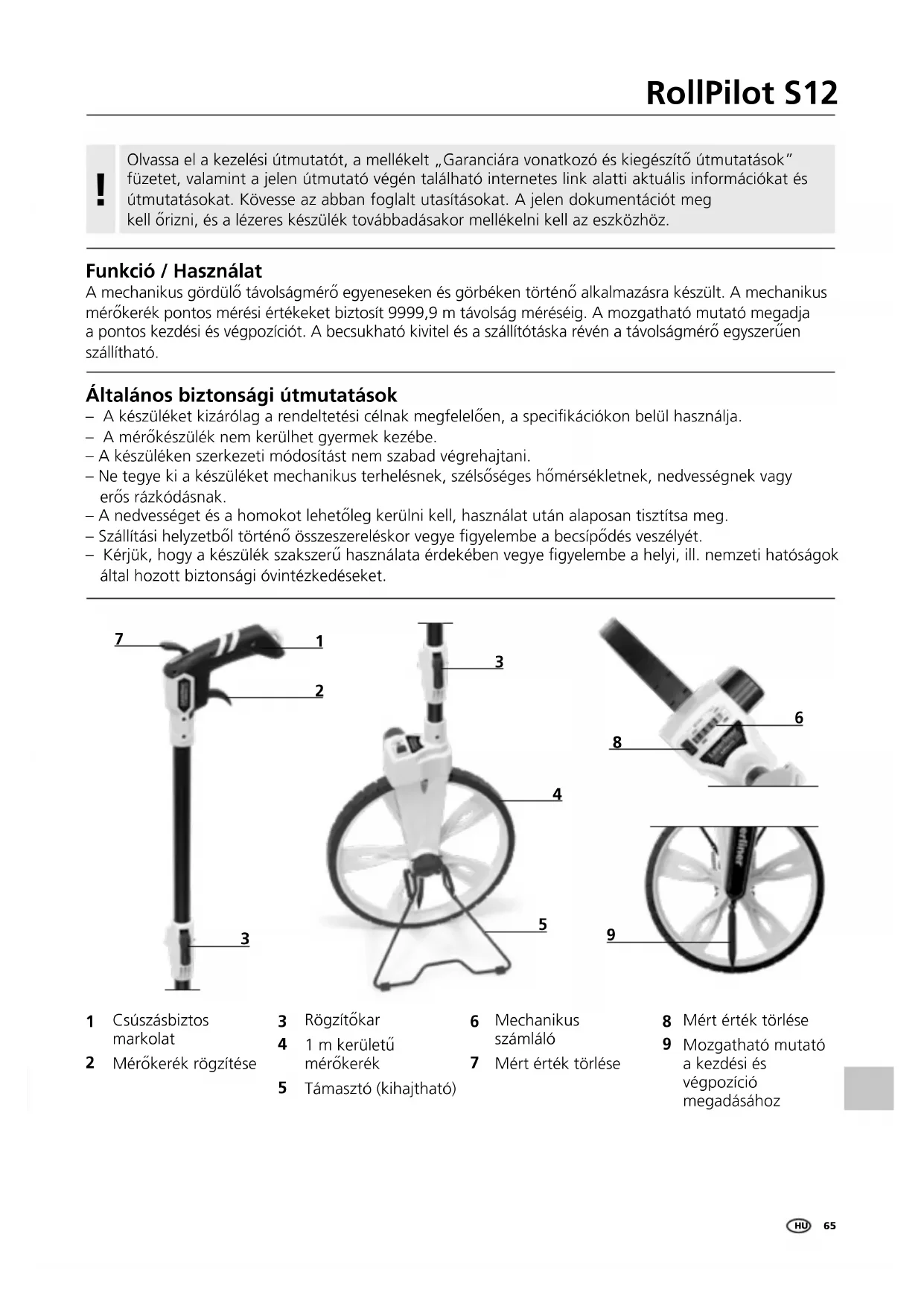 Funkció / Használat A mechanikus gördülő távolságmérő egyeneseken és görbéken történő alkalmazásra készült. A mechanikus mérőkerék pontos mérési értékeket biztosít 9999,9 m távolság méréséig. A mozgatható mutató megadja a pontos kezdési és végpozíciót. A becsukható kivitel és a szállítótáska révén a távolságmérő egyszerűen szállítható. Általános biztonsági útmutatások – A készüléket kizárólag a rendeltetési célnak megfelelően, a specikációkon belül használja. – A mérőkészülék nem kerülhet gyermek kezébe. – A készüléken szerkezeti módosítást nem szabad végrehajtani. – Ne tegye ki a készüléket mechanikus terhelésnek, szélsőséges hőmérsékletnek, nedvességnek vagy erős rázkódásnak. – A nedvességet és a homokot lehetőleg kerülni kell, használat után alaposan tisztítsa meg. – Szállítási helyzetből történő összeszereléskor vegye gyelembe a becsípődés veszélyét. – Kérjük, hogy a készülék szakszerű használata érdekében vegye gyelembe a helyi, ill. nemzeti hatóságok által hozott biztonsági óvintézkedéseket.