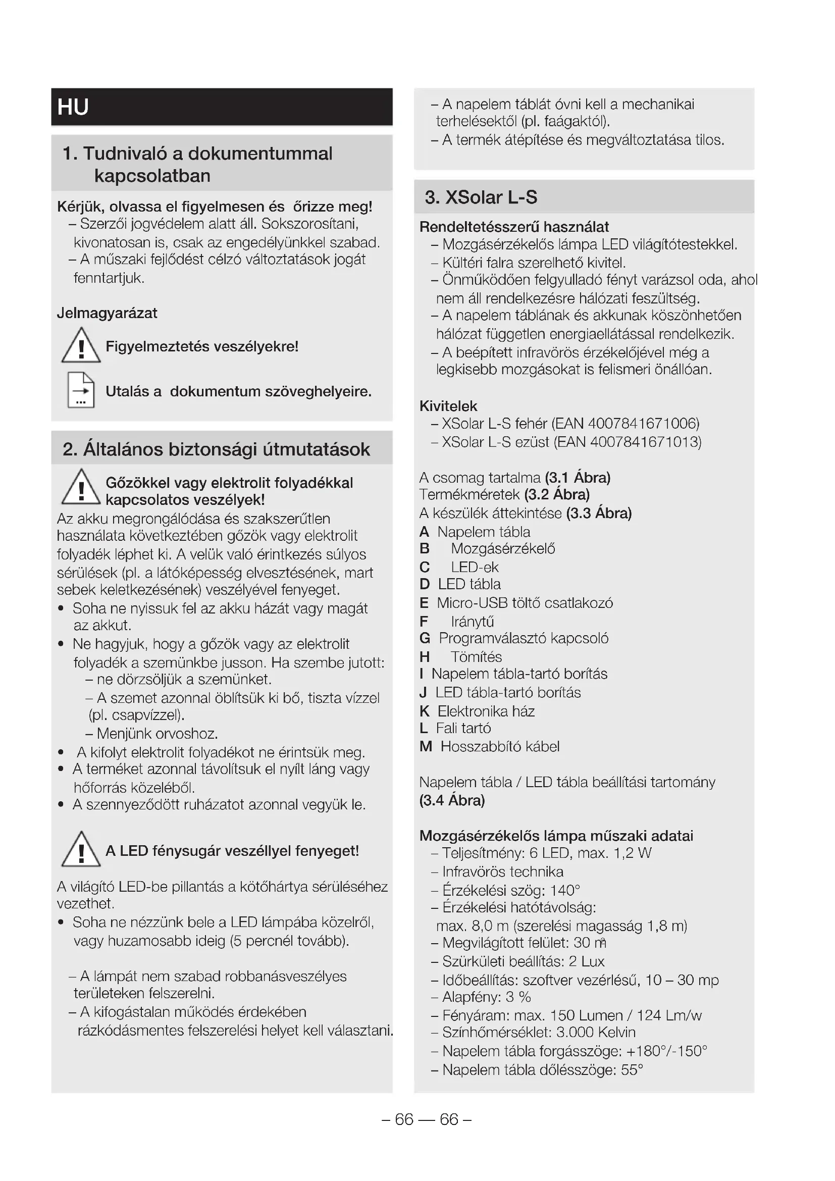 Rendeltetésszerű használat – Mozgásérzékelős lámpa LED világítótestekkel. – Kültéri falra szerelhető kivitel. – Önműködően felgyulladó fényt varázsol oda, ahol nem áll rendelkezésre hálózati feszültség. – A napelem táblának és akkunak köszönhetően hálózat független energiaellátással rendelkezik. – A beépített infravörös érzékelőjével még a legkisebb mozgásokat is felismeri önállóan. Kivitelek – XSolar L-S fehér (EAN4007841671006) – XSolar L-S ezüst (EAN4007841671013) A csomag tartalma (3.1 Ábra) Termékméretek (3.2 Ábra) A készülék áttekintése (3.3 Ábra) A Napelem tábla B Mozgásérzékelő C LED-ek D LED tábla E Micro-USB töltő csatlakozó F Iránytű G Programválasztó kapcsoló H Tömítés I Napelem tábla-tartó borítás J LED tábla-tartó borítás K Elektronika ház L Fali tartó M Hosszabbító kábel Napelem tábla/LED tábla beállítási tartomány (3.4 Ábra) Mozgásérzékelős lámpa műszaki adatai – Teljesítmény: 6 LED, max. 1,2 W – Infravörös technika – Érzékelési szög: 140° – Érzékelési hatótávolság: max. 8,0 m (szerelési magasság 1,8 m) – Megvilágított felület: 30 m
