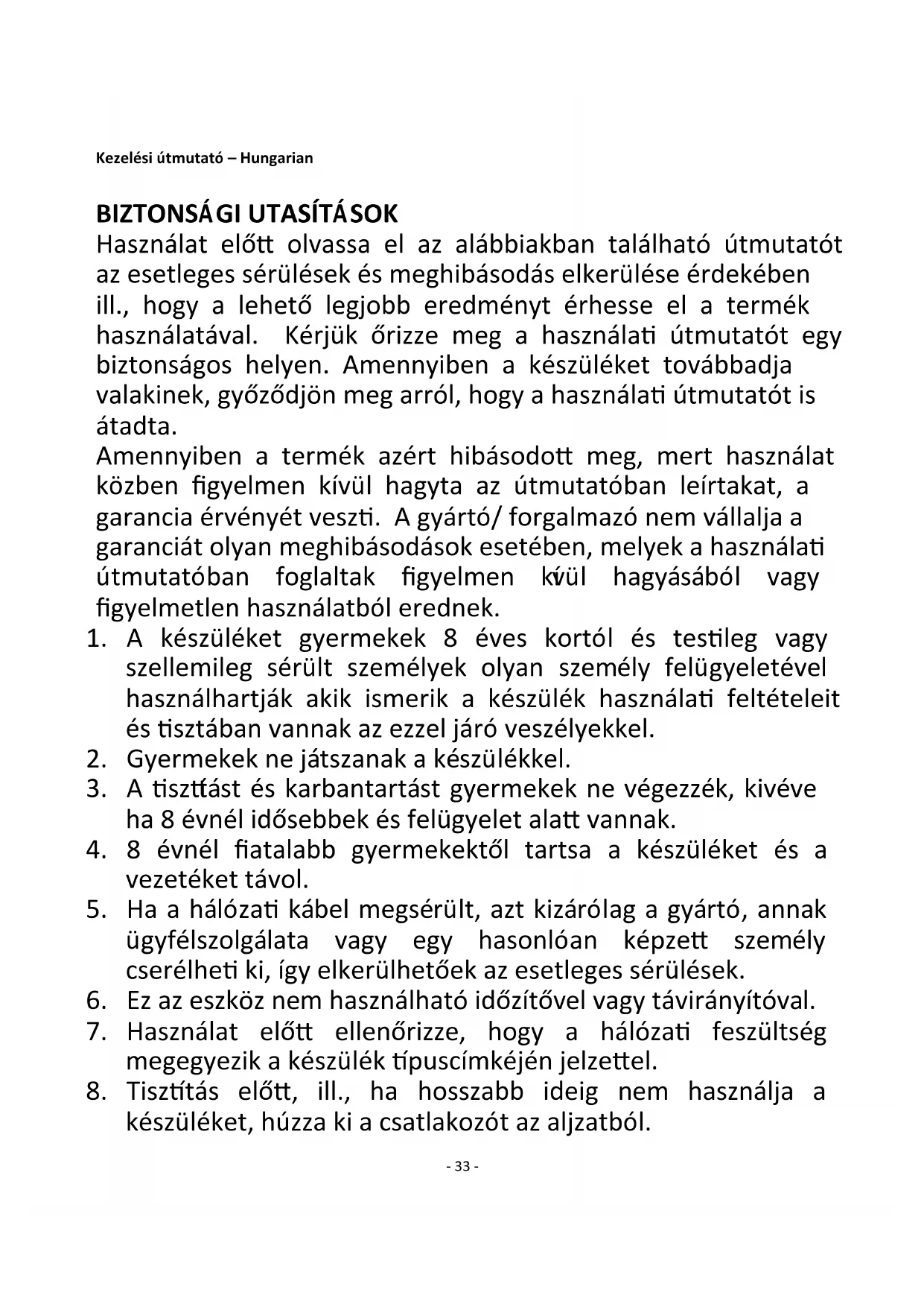 1. A készülék kizárólag háztartási használatra alkalmas.