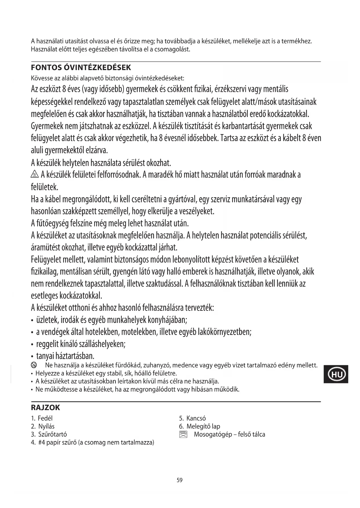 Kövesse az alábbi alapvető biztonsági óvintézkedéseket: Az eszközt 8 éves (vagy idősebb) gyermekek és csökkent zikai, érzékszervi vagy mentális képességekkel rendelkező vagy tapasztalatlan személyek csak felügyelet alatt/mások utasításainak megfelelően és csak akkor használhatják, ha tisztában vannak a használatból eredő kockázatokkal. Gyermekek nem játszhatnak az eszközzel. A készülék tisztítását és karbantartását gyermekek csak felügyelet alatt és csak akkor végezhetik, ha 8 évesnél idősebbek. Tartsa az eszközt és a kábelt 8 éven aluli gyermekektől elzárva. A készülék helytelen használata sérülést okozhat. h A készülék felületei felforrósodnak. A maradék hő miatt használat után forróak maradnak a felületek. Ha a kábel megrongálódott, ki kell cseréltetni a gyártóval, egy szerviz munkatársával vagy egy hasonlóan szakképzett személlyel, hogy elkerülje a veszélyeket. A fűtőegység felszíne még meleg lehet használat után. A készüléket az utasításoknak megfelelően használja. A helytelen használat potenciális sérülést, áramütést okozhat, illetve egyéb kockázattal járhat. Felügyelet mellett, valamint biztonságos módon lebonyolított képzést követően a készüléket zikailag, mentálisan sérült, gyengén látó vagy halló emberek is használhatják, illetve olyanok, akik nem rendelkeznek tapasztalattal, illetve szaktudással. A felhasználóknak tisztában kell lenniük az esetleges kockázatokkal. A készüléket otthoni és ahhoz hasonló felhasználásra tervezték: