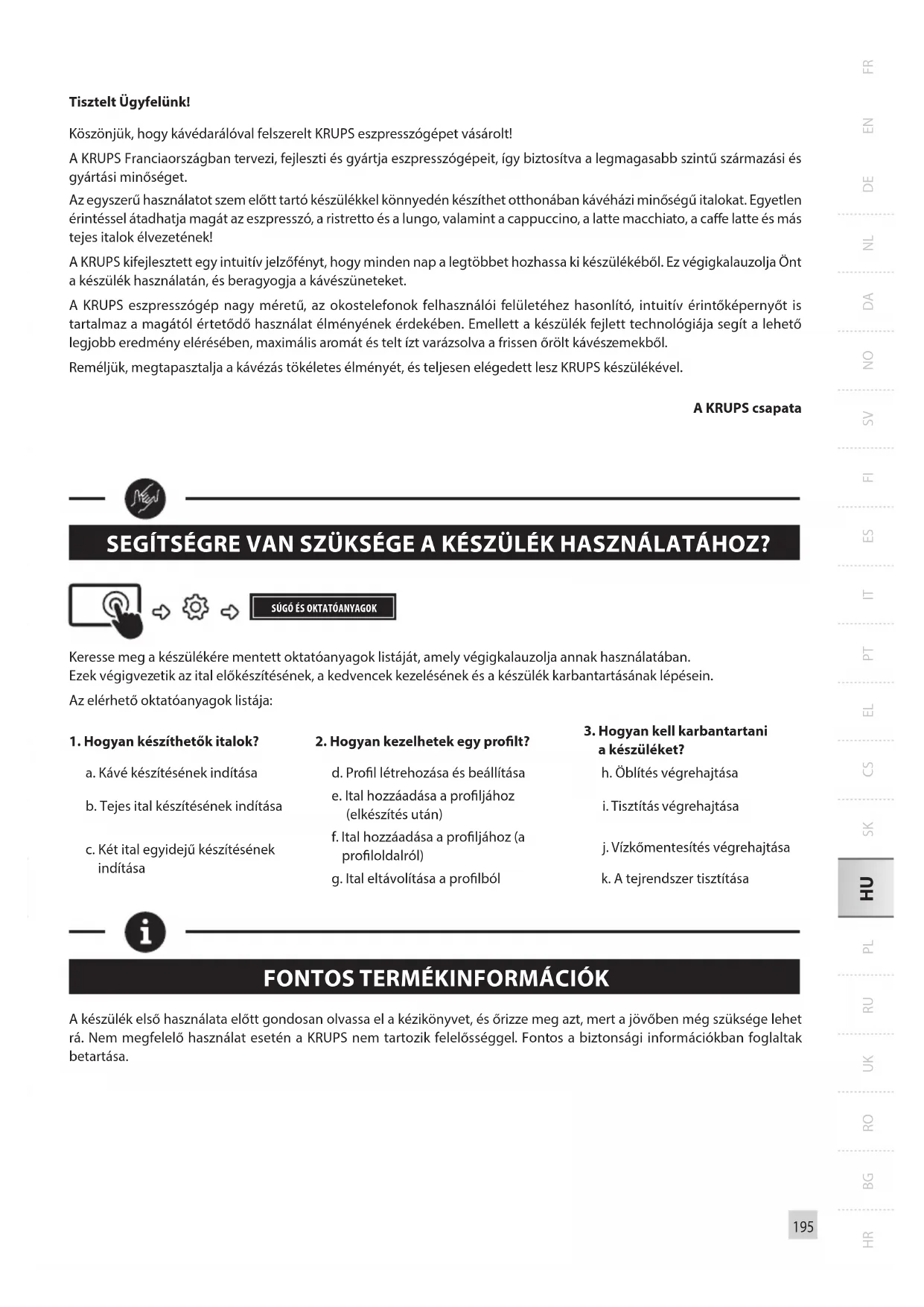 Tisztelt Ügyfelünk! Köszönjük, hogy kávédarálóval felszerelt KRUPS eszpresszógépet vásárolt! A KRUPS Franciaországban tervezi, fejleszti és gyártja eszpresszógépeit, így biztosítva a legmagasabb szintű származási és gyártási minőséget. Az egyszerű használatot szem előtt tartó készülékkel könnyedén készíthet otthonában kávéházi minőségű italokat. Egyetlen érintéssel átadhatja magát az eszpresszó, a ristretto és a lungo, valamint a cappuccino, a latte macchiato, a cae latte és más tejes italok élvezetének! A KRUPS kifejlesztett egy intuitív jelzőfényt, hogy minden nap a legtöbbet hozhassa ki készülékéből. Ez végigkalauzolja Önt a készülék használatán, és beragyogja a kávészüneteket. A KRUPS eszpresszógép nagy méretű, az okostelefonok felhasználói felületéhez hasonlító, intuitív érintőképernyőt is tartalmaz a magától értetődő használat élményének érdekében. Emellett a készülék fejlett technológiája segít a lehető legjobb eredmény elérésében, maximális aromát és telt ízt varázsolva a frissen őrölt kávészemekből. Reméljük, megtapasztalja a kávézás tökéletes élményét, és teljesen elégedett lesz KRUPS készülékével. A KRUPS csapata SEGÍTSÉGRE VAN SZÜKSÉGE A KÉSZÜLÉK HASZNÁLATÁHOZ?