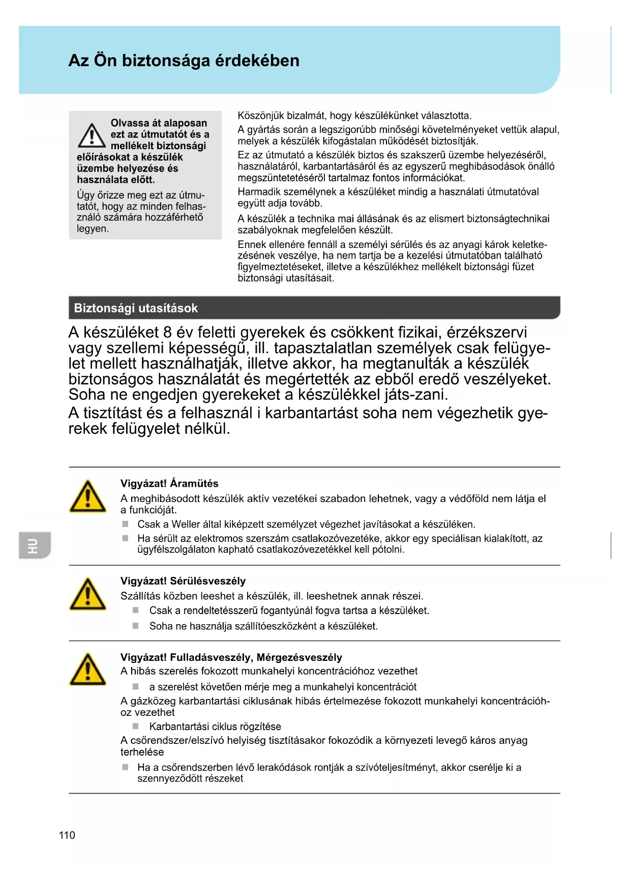 tás Ápolás és karbantartás Figyelmeztetés Klönböző folyasztószerek, folyasztószer-összetevők valamint a beszívott levegő klönböző porai lényege- sen csökkenthetik a szűrő élettartamát. Ragasztógőzök elszívása esetén (részecskeszűrő nélkli) gázszűrőt kell használni. szrrendszerszaályosmkdéséhezakvetkezképpenkell cserélniaszrt legaláéventeegyszer akijelzéstkvetenvagy amegengedettátlagosmunkahelyikoncentrácitllépésekorvagy akarantartásitervszerint szrszennyezettségénekmértékétanyomásklnségmérésével állapítjamegakészlékszrkijelzjeaszraktuálisállapotát mutatja. Pirosszrtele árgaszrtelítettség ldszrtelítettség Az elhasználódott szűrőt hangjelzés jelzi: angjelzésránként rautánfélránként rautánpercenként rautánmegszakításnélkl részecskeszrésagázszregymáshozvanillesztveígy kompaktszrkéntegyttcserélhetkkifogástalanszrfunkci iztosításáhozakompaktszrtéventeegyszerkikellcserélni nomporszrszrszvetakompaktszrelszrjeésezért gyakraankellcserélniElegendazelszrszvetetkicserélniha akészlékismételtzemehelyezésétkvetenmárnemvilágíta piros LED. Vigyázat! Mielőtt bármilyen munkához kezd a gépen, áramtalanítsa (húzza ki a konnektorból)! Csak eredeti WELLER alkat- részeket használjon. A szennyezett szűrőket veszélyes hulladékként kell kezelni. A kicserélt készülékalka- trészeket, szűrőt vagy a használt készüléket az Ön országának előírásai szerint ártalmatlanítsa.116