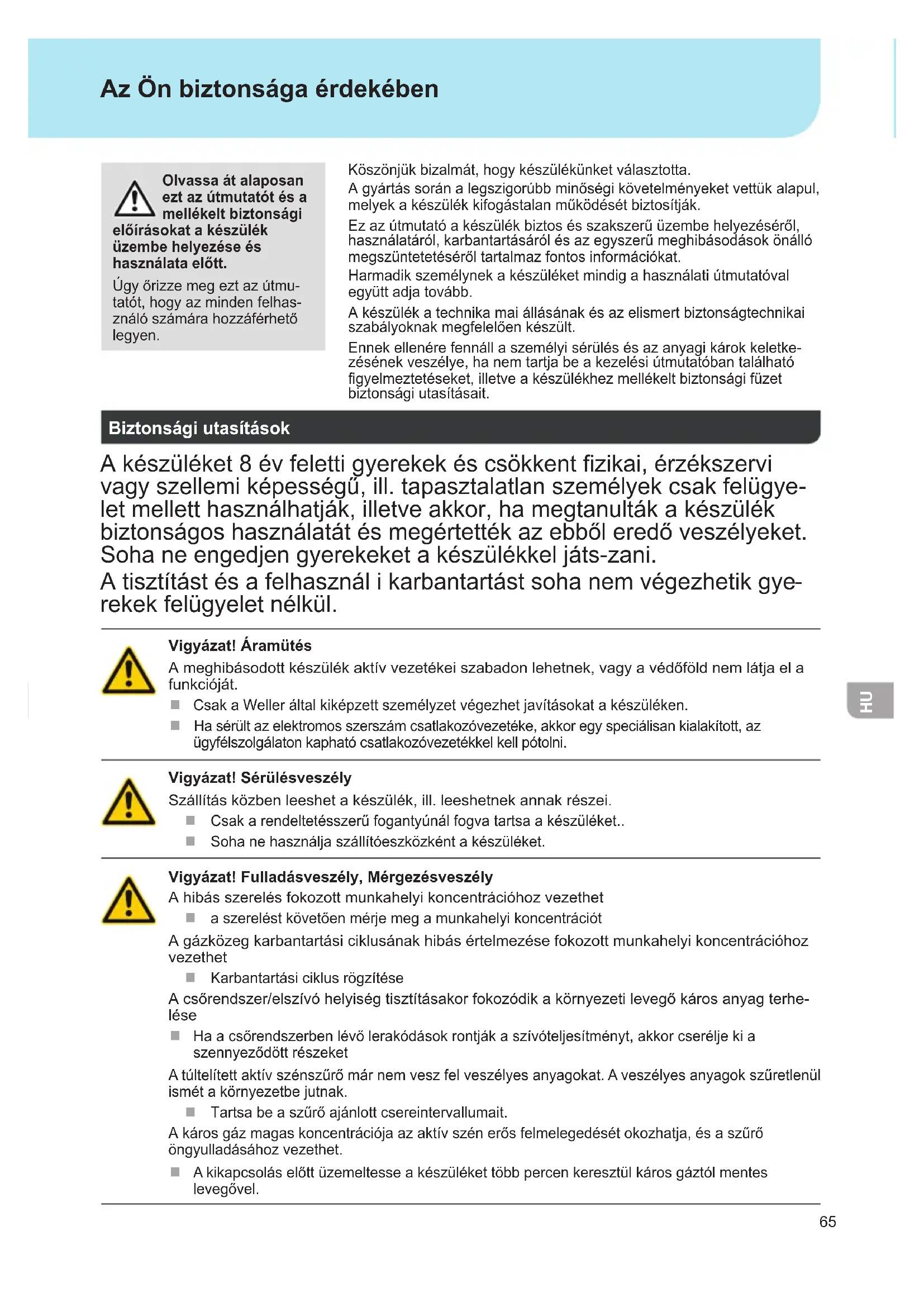 Rendeltetésszerű használat Ezaszűrőrendszerrészecskékésgázokszűrésérealkalmas-azadottszűrőközegtőlfüggően. Vigyázat! Fulladásveszély, Mérgezésveszély Szakszerűtlenhasználatalégzésiproblémákat,fulladást,mérgezéstvagyrákotokozhat Aszűrőközegneknemmegfelelőrészecskéketésgázokatnemszabadelszívni. Folyadékotvagyéghetőgázokattiloselszívni Sohanehasználjaszűrőnélkülvagyteleszűrővelakészüléket. Sohanehasználjaakészüléketaventilátorlefedésenélkül Ezakészülékcsakszobahőmérsékletenésbeltérbenhasználható. Akészüléketfelületelszívásáratervezték,ésnemalkalmasaforrasztópákánáltörténőközvetlenels- zívásra. Akészülékrendeltetésszerűhasználatamagábanfoglaljaaztis,hogy Önbetartjaazútmutatóbanfoglaltakat, Önmindentovábbikísérődokumentációtgyelembevesz, Önbetartjaazalkalmazáshelyénérvényesnemzetibalesetvédelmielőírásokat. Lakkszigetelésűhuzalokforrasztásavagyhegesztése LakkszigetelésűhuzalokforrasztásavagyhegesztéseeseténhasználjonstandardelőszűrőkéntM5 közegszűrőt. Ragasztógőzökelszívása Ragasztógőzökelszívásáhozhasználjonszélessávúgázszűrőt(aeroszolszűrőnélkül). Akészülékenönhatalmúlagvégzettmódosításokértagyártónemvállalfelelősséget. Felhasználói csoportok Akülönbözőnagyfokúkockázatokésveszélyforrásokmiattegyesmunkafolyamatokatcsakképzettszakem- berek végezhetnek. Munkafolyamat Felhasználói csoportok Komplexcsőrendszerekszerelésetöbbelszívókar csatlakoztatásával Műszakiképzettségűszakszemélyzet Elektromos alkatrészek cseréje Villamos szakember Karbantartásiintervallumokmeghatározása Biztonságiszakember Kezelés Szűrőcsere Laikusok Komplexcsőrendszerekszerelésetöbbelszívókar csatlakoztatásával Elektromos alkatrészek cseréje Műszakitanulókegyképzettszakemberirányításaés felügyeletemellett Garancia Avevőszavatosságiigényeiakészülékvevőhöztörténtkiszállításátólszámítottegyévutánelévülnek. EznemvonatkozikavevőBGB(NémetSzövetségiPTK)§§478,479szerintiviszontkeresetiigényére. Azáltalunkrendelkezésrebocsátottgaranciaértelmébencsakakkorállunkjót,haakészüléktulajdonságaira éstartósságáravonatkozógaranciátírásbafoglaltukésa„Garancia“fogalmaalattbocsátottukki. Agaranciaérvényétveszítiszakszerűtlenhasználatesetén,illetvehaszakképzetlenszemélyekvégeznek rajtamódosításokat. A műszaki változtatások jogát fenntartjuk! További információkért kérjük, látogasson el a weboldalra www.weller-tools.com67