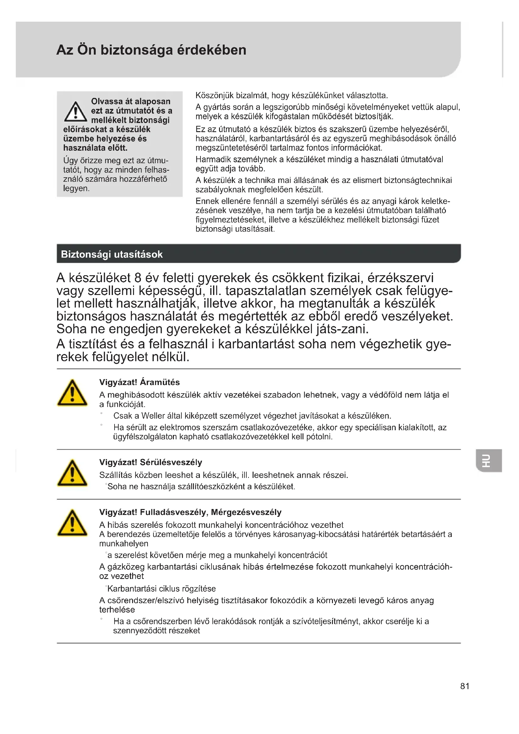 Az Ön biztonsága érdekében Olvassa át alaposan ezt az útmutatót és a mellékelt biztonsági előírásokat a készülék üzembe helyezése és használata előtt. Úgyőrizzemegeztazútmu- tatót,hogyazmindenfelhas- ználószámárahozzáférhető legyen. Köszönjükbizalmát,hogykészülékünketválasztotta. Agyártássoránalegszigorúbbminőségikövetelményeketvettükalapul, melyekakészülékkifogástalanműködésétbiztosítják. Ezazútmutatóakészülékbiztosésszakszerűüzembehelyezéséről, használatáról,karbantartásárólésazegyszerűmeghibásodásokönálló megszüntetetésérőltartalmazfontosinformációkat. Harmadikszemélynekakészüléketmindigahasználatiútmutatóval együttadjatovább. Akészülékatechnikamaiállásánakésazelismertbiztonságtechnikai szabályoknakmegfelelőenkészült. Ennekellenérefennállaszemélyisérülésésazanyagikárokkeletke- zésénekveszélye,hanemtartjabeakezelésiútmutatóbantalálható gyelmeztetéseket,illetveakészülékhezmellékeltbiztonságifüzet biztonságiutasításait. Biztonsági utasítások Akészüléket8évfelettigyerekekéscsökkentzikai,érzékszervi vagyszellemiképességű,ill.tapasztalatlanszemélyekcsakfelügye- letmelletthasználhatják,illetveakkor,hamegtanultákakészülék biztonságoshasználatátésmegértettékazebbőleredőveszélyeket. Sohaneengedjengyerekeketakészülékkeljáts-zani. Atisztítástésafelhasználikarbantartástsohanemvégezhetikgye- rekekfelügyeletnélkül. Vigyázat! Áramütés Ameghibásodottkészülékaktívvezetékeiszabadonlehetnek,vagyavédőföldnemlátjael afunkcióját. ˚ CsakaWelleráltalkiképzettszemélyzetvégezhetjavításokatakészüléken. ˚ Hasérültazelektromosszerszámcsatlakozóvezetéke,akkoregyspeciálisankialakított,az ügyfélszolgálatonkaphatócsatlakozóvezetékkelkellpótolni. Vigyázat! Sérülésveszély Szállításközbenleeshetakészülék,ill.leeshetnekannakrészei. ˚ Sohanehasználjaszállítóeszközkéntakészüléket. Vigyázat! Fulladásveszély, Mérgezésveszély Ahibásszerelésfokozottmunkahelyikoncentrációhozvezethet Aberendezésüzemeltetőjefelelősatörvényeskárosanyag-kibocsátásihatárértékbetartásáérta munkahelyen ˚ aszereléstkövetőenmérjemegamunkahelyikoncentrációt Agázközegkarbantartásiciklusánakhibásértelmezésefokozottmunkahelyikoncentrációh- oz vezethet ˚ Karbantartásiciklusrögzítése Acsőrendszer/elszívóhelyiségtisztításakorfokozódikakörnyezetilevegőkárosanyag terhelése ˚ Haacsőrendszerbenlévőlerakódásokrontjákaszívóteljesítményt,akkorcseréljekia szennyeződöttrészeket82