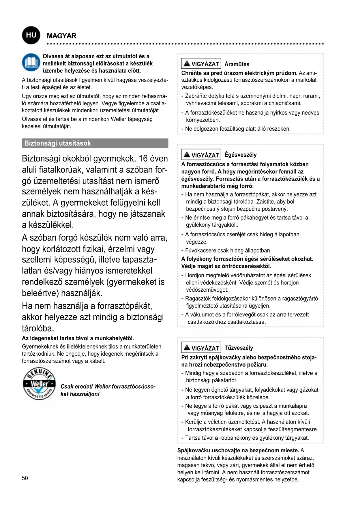 POLSKI50 Olvassa át alaposan ezt az tmutatót és a mellékelt biztonsági előrásokat a készülék üzembe helyezése és használata előtt. A biztonsági utasítások gyelmen kívül hagyása veszélyezte- ti a testi épséget és az életet. Úgy őrizze meg ezt az útmutatót, hogy az minden felhaszná- ló számára hozzáférhető legyen. Vegye gyelembe a csatla- koztatott készülékek mindenkori üzemeltetési útmutatóját. Olvassa el és tartsa be a mindenkori Weller tápegység kezelési útmutatóját. Biztonsági utasítások Biztonsági okokból gyermekek, 16 éven aluli atalkorúak, valamint a szóban for- gó üzemeltetési utasítást nem ismerő személyek nem használhatják a kés- züléket. A gyermekeket felügyelni kell annak biztosítására, hogy ne játszanak a készülékkel. A szóban forgó készülék nem való arra, hogy korlátozott zikai, érzelmi vagy szellemi képességű, illetve tapaszta