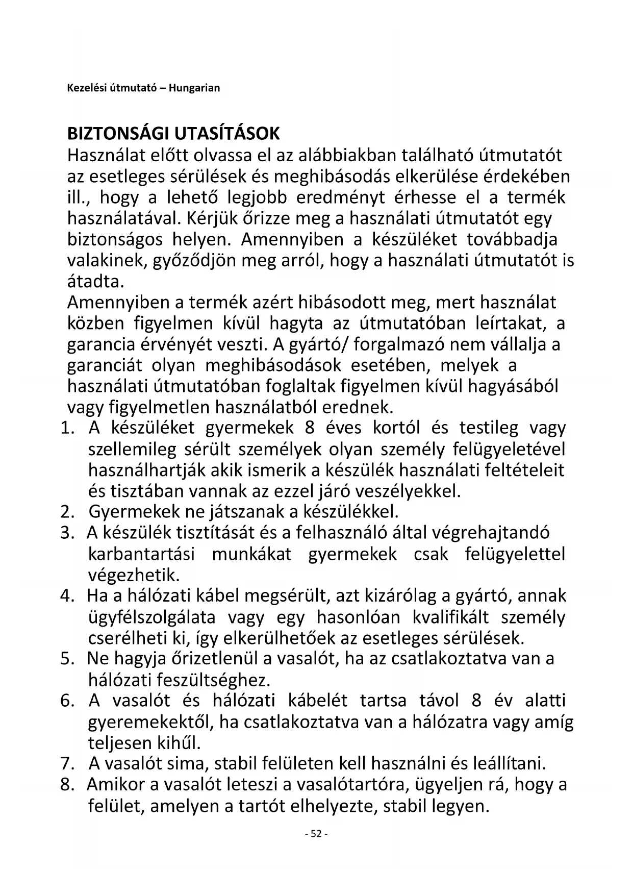 Használat előtt olvassa el az alábbiakban található útmutatót az esetleges sérülések és meghibásodás elkerülése érdekében ill., hogy a lehető legjobb eredményt érhesse el a termék használatával. Kérjük őrizze meg a használati útmutatót egy biztonságos helyen. Amennyiben a készüléket továbbadja valakinek, győződjön meg arról, hogy a használati útmutatót is átadta. Amennyiben a termék azért hibásodott meg, mert használat közben figyelmen kívül hagyta az útmutatóban leírtakat, a garancia érvényét veszti. A gyártó/ forgalmazó nem vállalja a garanciát olyan meghibásodások esetében, melyek a használati útmutatóban foglaltak figyelmen kívül hagyásából vagy figyelmetlen használatból erednek.