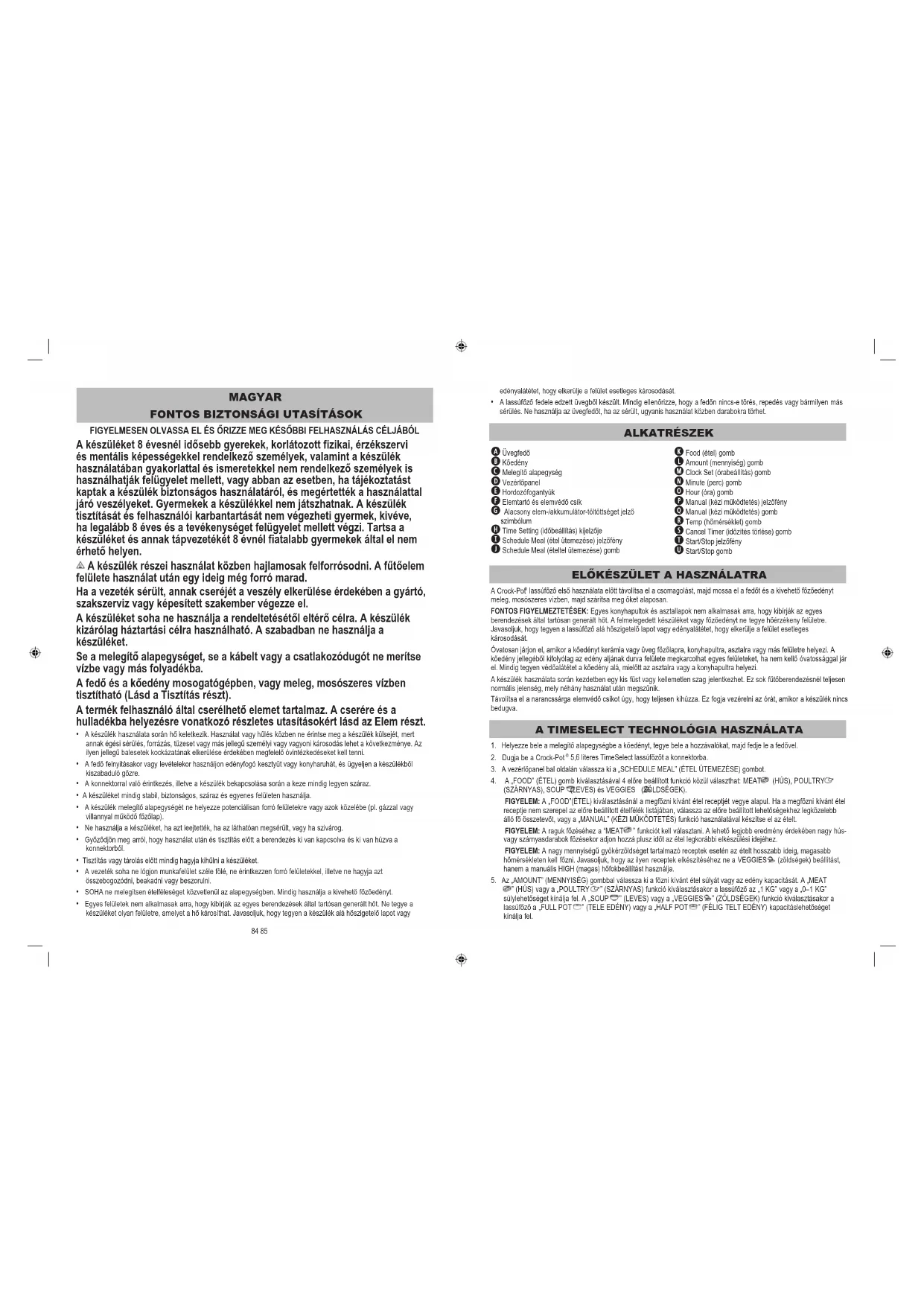 ” (HÚS) vagy a „POULTRY ” (SZÁRNYAS) funkció kiválasztásakor a lassúfőző az „1 KG” vagy a „0–1 KG” súlylehetőséget kínálja fel. A „SOUP ” (LEVES) vagy a „VEGGIES ” (ZÖLDSÉGEK) funkció kiválasztásakor a lassúfőző a „FULL POT ” (TELE EDÉNY) vagy a „HALF POT ” (FÉLIG TELT EDÉNY) kapacitáslehetőséget kínálja fel. A Üvegfedő B Kőedény C Melegítő alapegység D Vezérlőpanel E Hordozófogantyúk F Elemtartó és elemvédő csík G Alacsony elem-/akkumulátor-töltöttséget jelző szimbólum H Time Setting (időbeállítás) kijelzője I Schedule Meal (étel ütemezése) jelzőfény J Schedule Meal (ételtel ütemezése) gomb K Food (étel) gomb L Amount (mennyiség) gomb M Clock Set (órabeállítás) gomb N Minute (perc) gomb O Hour (óra) gomb P Manual (kézi működtetés) jelzőfény Q Manual (kézi működtetés) gomb R Temp (hőmérséklet) gomb S Cancel Timer (időzítés törlése) gomb T Start/Stop jelzőfény U Start/Stop gomb86 87 FIGYELEM: A „FULL POT ” (TELE EDÉNY) lehetőség a 3/4-éig megtöltött főzőedényre vonatkozik.