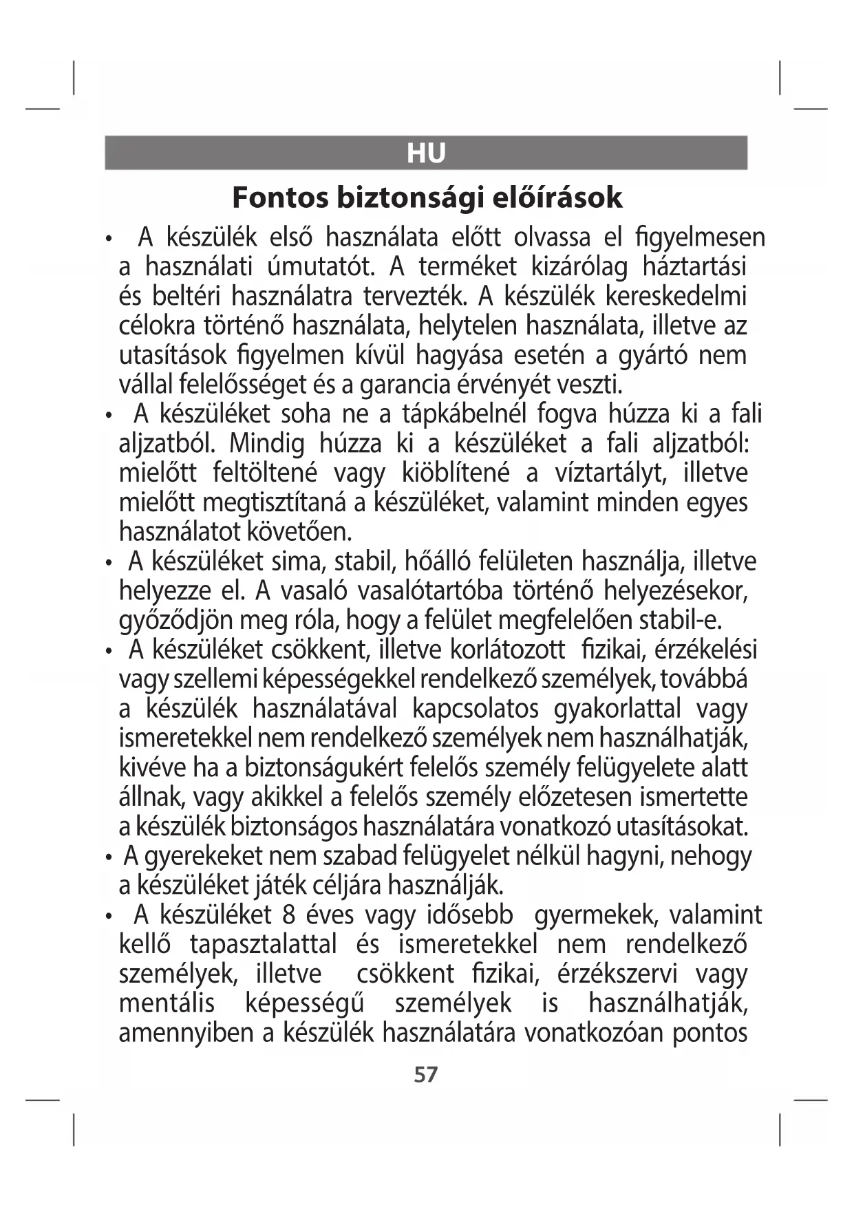 - A készüléket 8 éves vagy idősebb gyermekek, valamint kellő tapasztalattal és ismeretekkel nem rendelkező személyek, illetve csökkent zikai, érzékszervi vagy mentális képességű személyek is használhatják, amennyiben a készülék használatára vonatkozóan pontos 57útmutatást kaptak, felügyelet alatt állnak, és megértették az összes lehetséges kockázatot . Ne engedje, hogy a gyermekek játsszanak a készülékkel. A készülék tisztítását és felhasználói karbantartását gyermekek csak felügyelet mellett végezhetik. Az áram alatt lévő vagy lehűlő vasalót és annak vezetékét úgy tárolja, hogy azokhoz 8 évesnél atalabb gyermekek ne férhessenek hozzá.