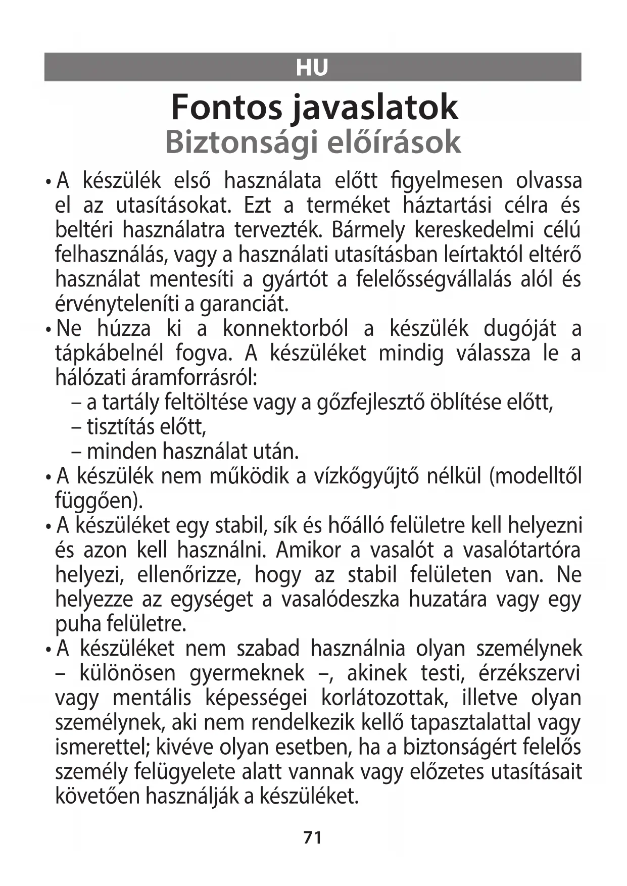 - A készüléket nem szabad használnia olyan személynek – különösen gyermeknek –, akinek testi, érzékszervi vagy mentális képességei korlátozottak, illetve olyan személynek, aki nem rendelkezik kellő tapasztalattal vagy ismerettel; kivéve olyan esetben, ha a biztonságért felelős személy felügyelete alatt vannak vagy előzetes utasításait követően használják a készüléket.72