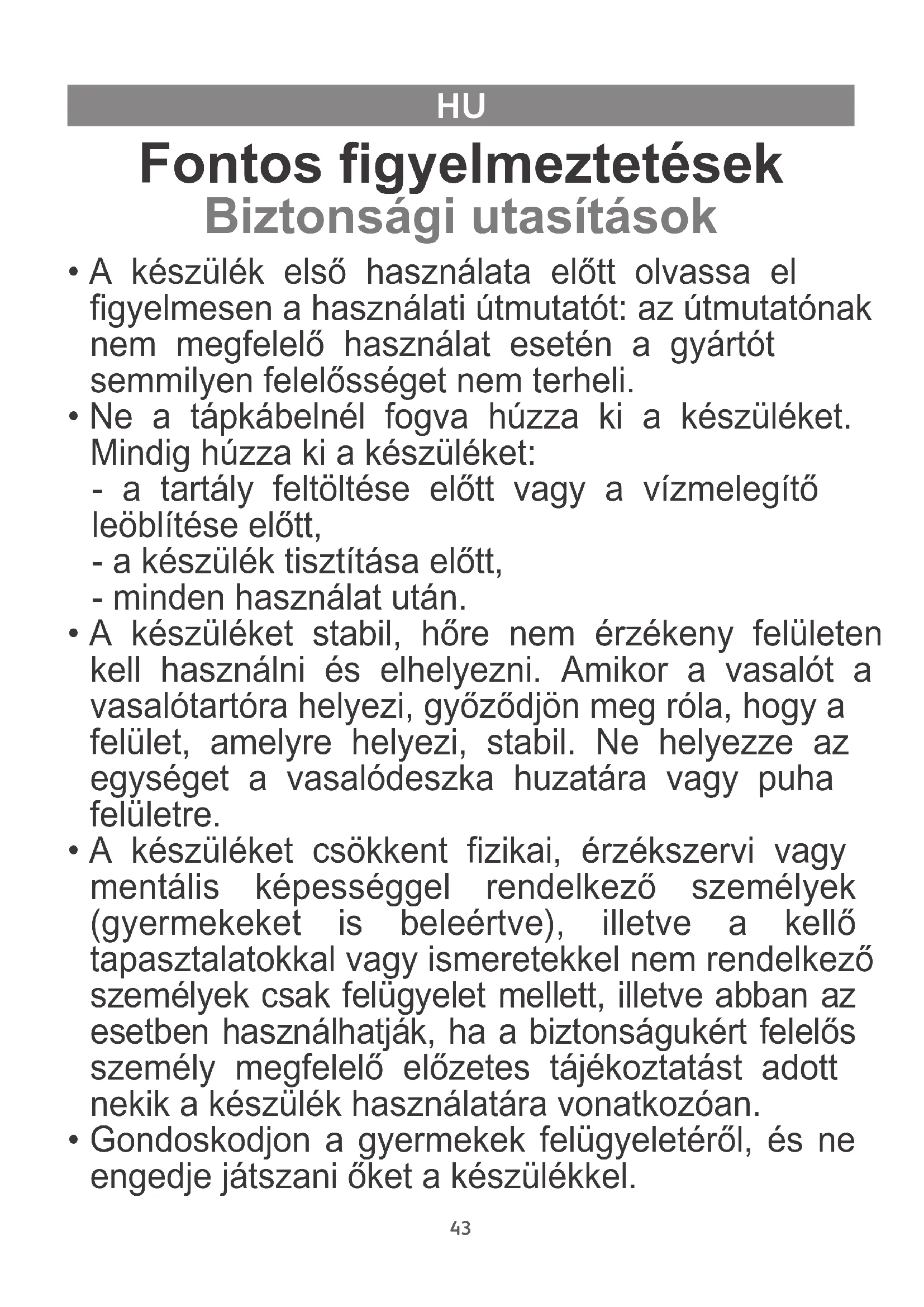 - Soha ne hagyja a készüléket felügyelet nélkül: amikor az az elektromos hálózatra csatlakoztatva van, amíg körülbelül 1 órán át hűl.