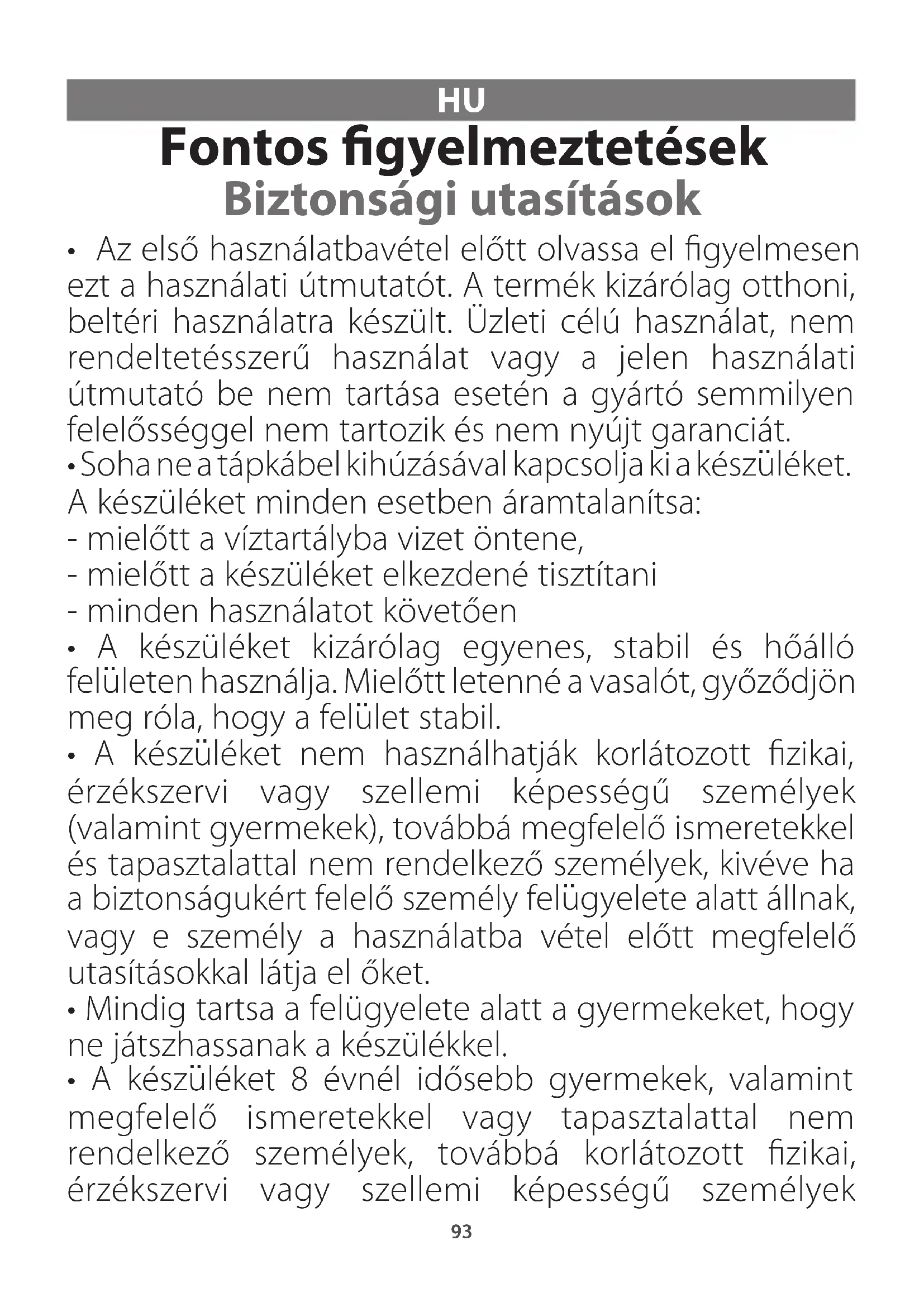 - A készuléket nem használhatják korlátozott zikai, érzékszervi vagy szellemi képességű személyek (valamint gyermekek), továbbá megfelelő ismeretekkel és tapasztalattal nem rendelkező személyek, kivéve ha a biztonságukért felelő személy felugyelete alatt állnak, vagy e személy a használatba vétel előtt megfelelő utasításokkal látja el őket.