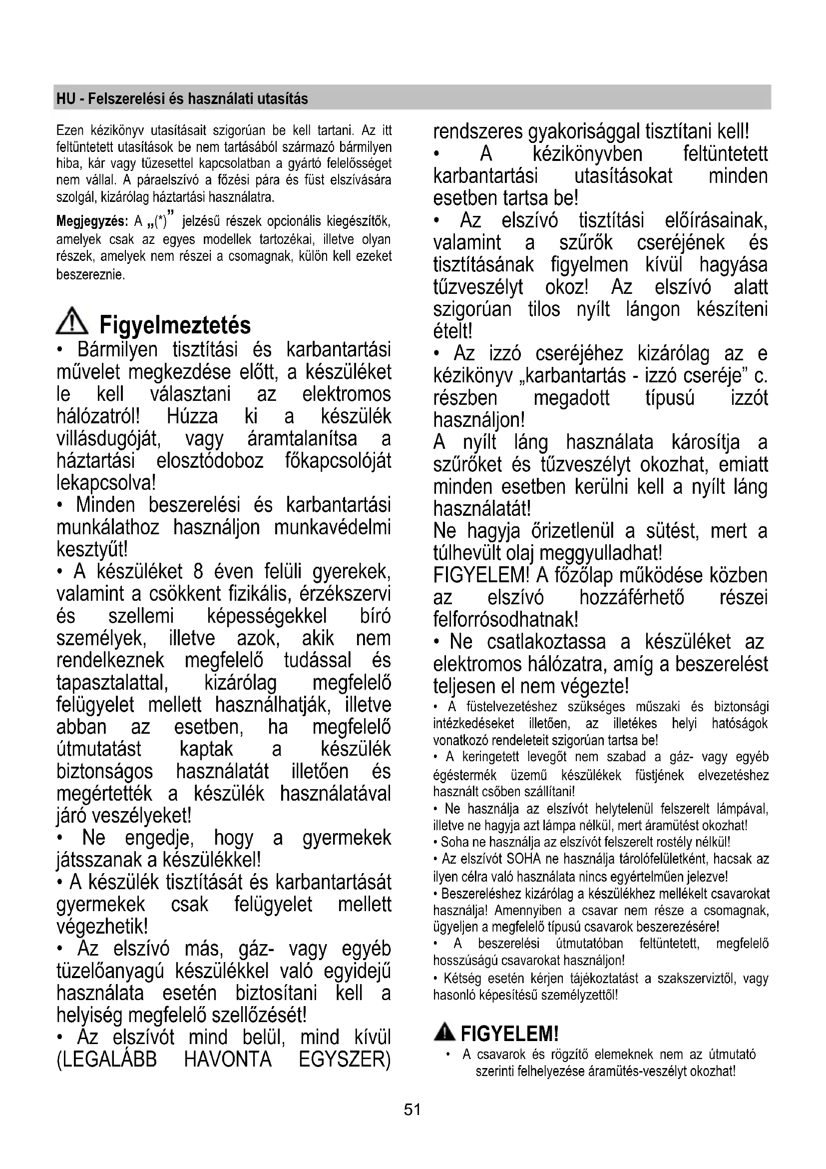 - Az elszívó tisztítási előírásainak, valamint a szűrők cseréjének és tisztításának figyelmen kívül hagyása tűzveszélyt okoz! Az elszívó alatt szigorúan tilos nyílt lángon készíteni ételt!