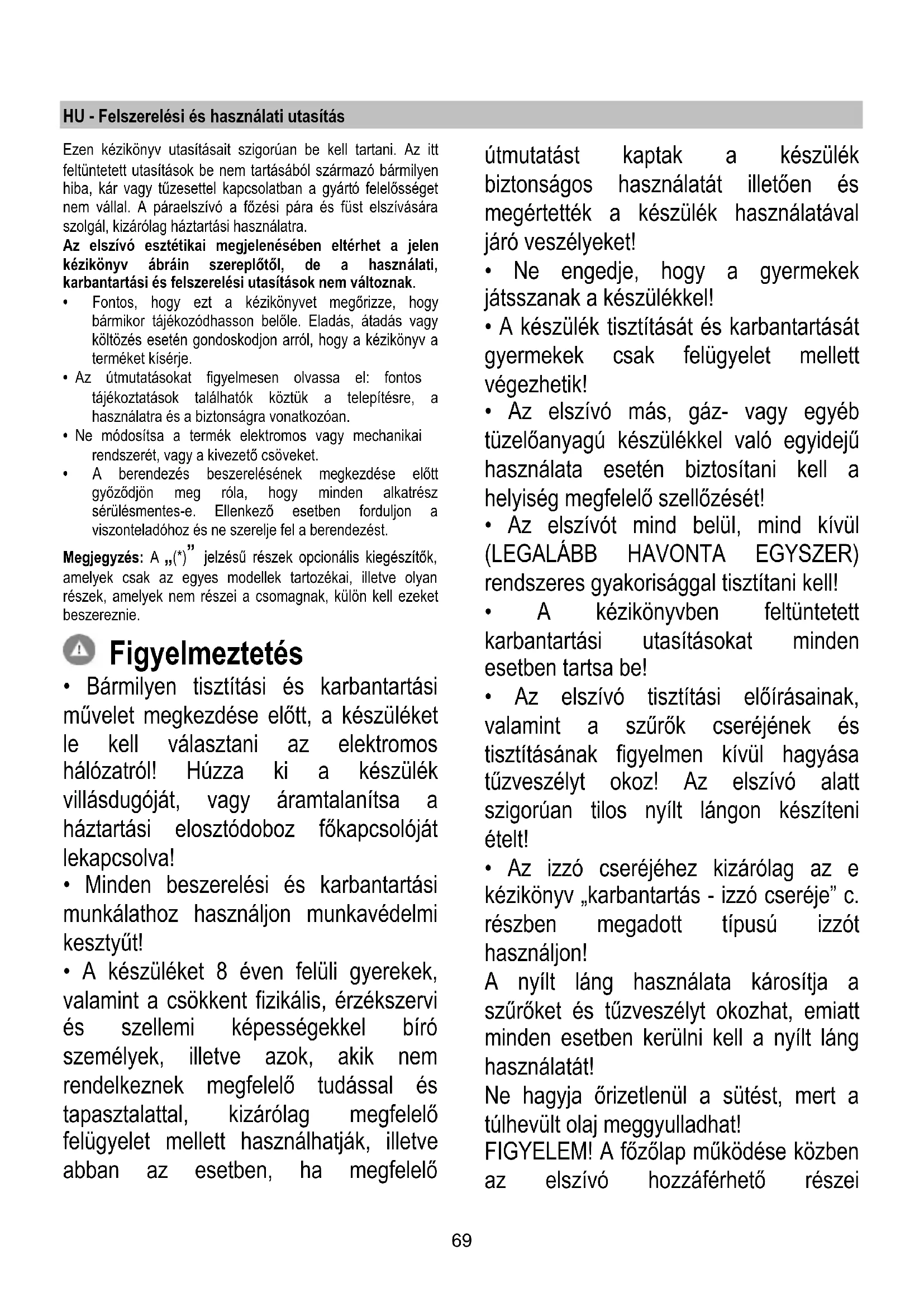 - Az elszívó tisztítási előírásainak, valamint a szűrők cseréjének és tisztításának figyelmen kívül hagyása tűzveszélyt okoz! Az elszívó alatt szigorúan tilos nyílt lángon készíteni ételt!