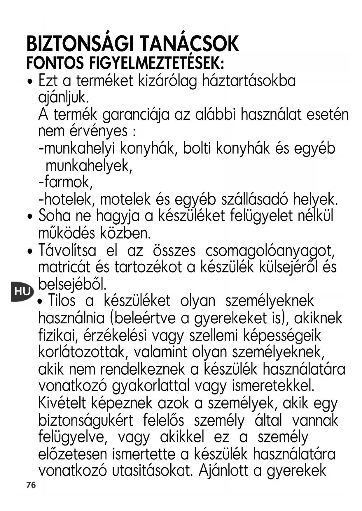 - Ez a készülék 8 éves vagy idősebb korú gyeremekek által is használható, továbbá csökkentett fizikai, érzékszervi vagy mentális képességekkel rendelkező, illetve tapasztalatlan személyek által is, ha azok felugyelve vannak és kaptak útmutatást a készülék biztonságos kezeléséről, valamint megértették a vele járó veszélyeket. A gyerekek ne játsszanak a készülékkel! A tisztítást és a karbantartást nem végezhetik 8 évnél fiatalabb gyermekek és az idősebbek is csak felügyelet mellett.