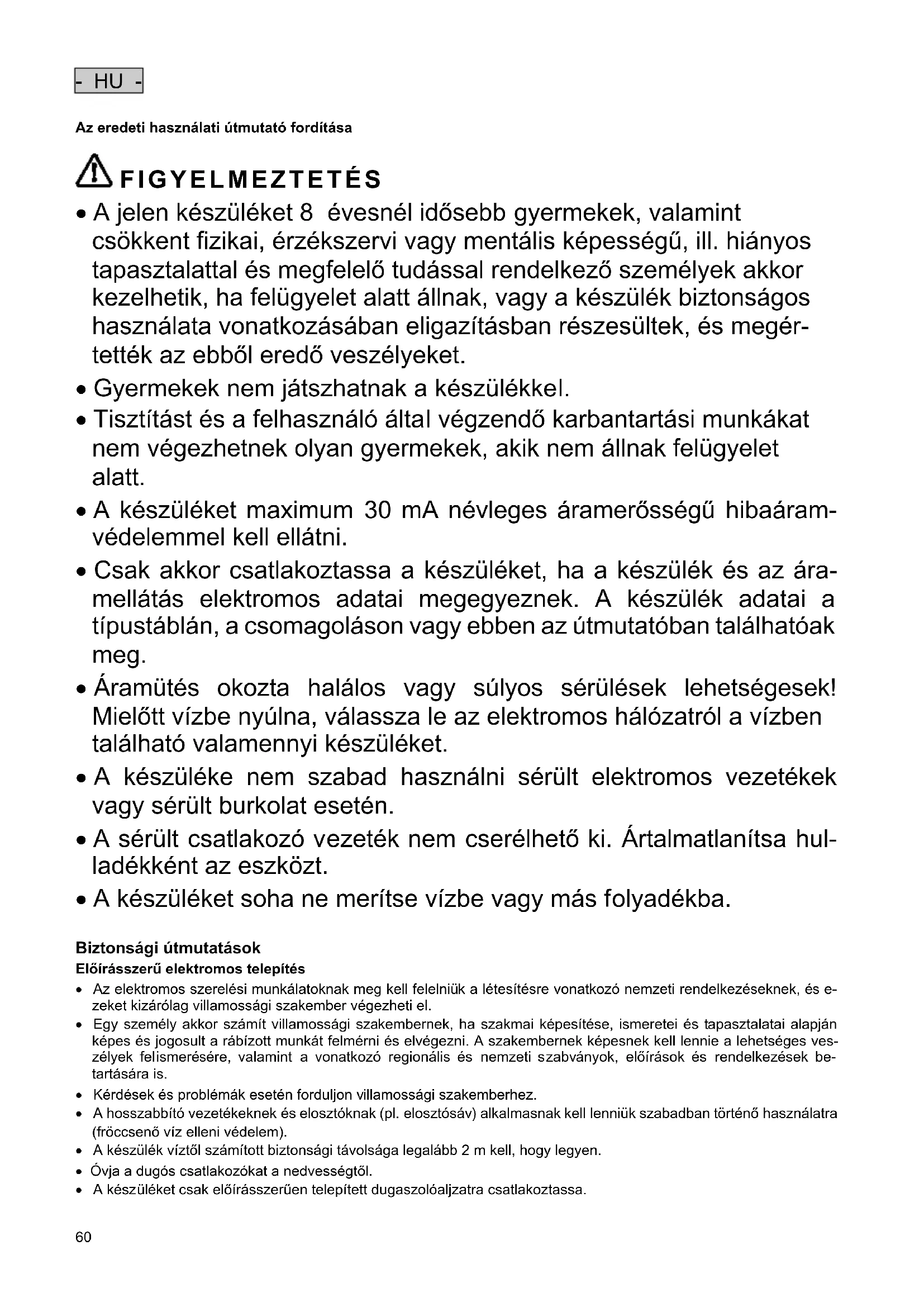 - A készüléket soha ne merítse vízbe vagy más folyadékba. Biztonsági útmutatások Előírásszerű elektromos telepítés