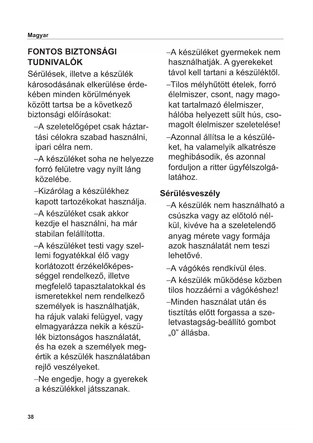 TUDNIVALÓK Sérülések, illetve a készülék károsodásának elkerülése érde- kében minden körülmények között tartsa be a következő biztonsági előírásokat: – A szeletelőgépet csak háztar- tási célokra szabad használni, ipari célra nem. – A készüléket soha ne helyezze forró felületre vagy nyílt láng közelébe. – Kizárólag a készülékhez kapott tartozékokat használja. – A készüléket csak akkor kezdje el használni, ha már stabilan felállította. – A készüléket testi vagy szel- lemi fogyatékkal élő vagy korlátozott érzékelőképes- séggel rendelkező, illetve megfelelő tapasztalatokkal és ismeretekkel nem rendelkező személyek is használhatják, ha rájuk valaki felügyel, vagy elmagyarázza nekik a készü- lék biztonságos használatát, és ha ezek a személyek meg- értik a készülék használatában rejlő veszélyeket. – Ne engedje, hogy a gyerekek a készülékkel játsszanak. – A készüléket gyermekek nem használhatják. A gyerekeket távol kell tartani a készüléktől. – Tilos mélyhűtött ételek, forró élelmiszer, csont, nagy mago- kat tartalmazó élelmiszer, hálóba helyezett sült hús, cso- magolt élelmiszer szeletelése! – Azonnal állítsa le a készülé- ket, ha valamelyik alkatrésze meghibásodik, és azonnal forduljon a ritter ügyfélszolgá- latához. Sérülésveszély – A készülék nem használható a csúszka vagy az előtoló nél- kül, kivéve ha a szeletelendő anyag mérete vagy formája azok használatát nem teszi lehetővé. – A vágókés rendkívül éles. – A készülék működése közben tilos hozzáérni a vágókéshez! – Minden használat után és tisztítás előtt forgassa a sze- letvastagság-beállító gombot „0” állásba. Magyar39 Hajtsa ki az ábrákat a könyv elülső, illetve hátsó borítójából. Olvassa el gyelmesen a kezelési útmutatót a készülék haszná- latbavétele előtt. A kezelési útmutatót őrizze meg, és adja át azt a készülék esetleges új tulajdonosának. A kezelési útmutató aktuális változata a www.ritterwerk.de oldalon is megtalálható.