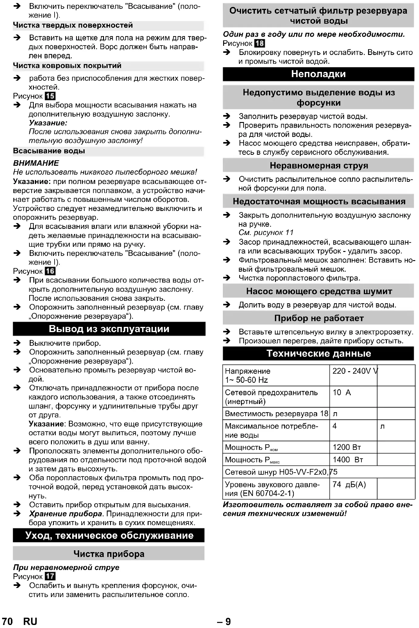 Keményburkolatok nedves tisztítása A friss víz tartály feltöltése A munka megkezdése A tartály kiürítése munka közben Tisztítási tippek/Munkamenet Tisztítási módszerek Enyhe / normál szennyeződés 73HU– 8 Ezután kapcsolja ki a szórás kapcsolót és szívja fel a tisztítószer maradékot. A tisztítás után a szőnyeget még egyszer tiszta, meleg vízzel tisztítsa meg és igény szerint impreg- nálja. Szórás bekapcsolása (I. állás). Tisztítószert felvinni és 5 percig hatni hagyni (a szí- vás ki van kapcsolva). A felületet ugyanúgy tisztítani, mint enyhe / normál szennyezettség esetén. A tisztítás után a szőnyeget még egyszer tiszta, meleg vízzel tisztítsa meg és igény szerint impreg- nálja. A készülékben található folyadékvezetékeket átöb- líteni, ehhez: A tisztítószer tartályt kb. 1 liter tiszta vízzel megtöl- teni. A fúvókát a lefolyó fölé tartani, a szórópumpát be- kapcsolni és addig üzemeltetni, amíg el nem fogy a tiszta víz. Megjegyzés Ahhoz, hogy a készüléket többcélú porszívóként lehes- sen használni, a szóró markolatot és a permetező tömlő le lehet venni. Ábra Vegye le a szórótömlőket és a rögzítő kapcsokat a szívótömlőről és a szívócsőről. Nyomja össze mindkét rögzítőpecket és húzza le a szóró markolatot a kézi fogantyúról. FIGYELEM Száraz porszíváskor mindig helyezze be a porzsákot. Patronszűrő (külön tartozék) segítségével javítható a szűrés minősége. Tartálynak és a tartozékoknak száraznak kell lenniük, egyébként szenny ragadhat rájuk. Válassza ki a kívánt tartozékot és helyezze fel a szívócsőre ill. közvetlenül a kézi fogantyúra. Ábra Helyezze be a porzsákot. Válassza ki a kívánt tartozékot és helyezze fel a szívócsőre ill. közvetlenül a kézi fogantyúra. Szívás bekapcsolása (I. állás). Nyomja be a keményburkolat-betétet a padlófejbe. A sörtéknek előre kell mutatni. A kemény felületek tisztítására szolgáló rátét nélkül dolgozzon. Ábra A szíváserősség beállításához mozgassa a légto- lattyút. Megjegyzés: Használat után ismét zárja be a légtolattyút! FIGYELEM Ne használjon porzsákot! Megjegyzés: Ha a tartály megtelik, akkor az úszó lezár- ja a szívónyílást és a készülék megnövelt fordulatszám- mal dolgozik. Azonnal kapcsolja ki a készüléket és ürít- se ki a tartályt. Nedvesség felszívásához helyezze fel a kívánt tar- tozékot a szívócsőre ill. közvetlenül a kézi fogan- tyúra. Szívás bekapcsolása (I. állás). Ábra Nyissa ki a légtolattyút, ha nagy mennyiségű vizet szív fel. Használat után ismét zárja be. Ürítse ki a megtelt tartályt (lásd a "Tartály ürítése" fejezetet). A készüléket ki kell kapcsolni. Ürítse ki a megtelt tartályt (lásd a "Tartály ürítése" fejezetet). A tartályt alaposan öblítse ki tiszta vízzel. Minden használat után távolítsa el a készülékről a tartozékokat, valamint válassza szét a tömlőt, fúvó- kát és a hosszabbító csöveket. Megjegyzés: Az esetlegesen még bent lévő mara- dék vizet kicsöpöghet, ezért legjobb, ha zuhanytál- cára ill. fürdőkádba helyezi. A tartozékokat egyesével folyóvíz alatt öblítse ki, és ezután hagyja megszáradni. Tisztítsa meg a szivacs szűrőt folyó víz alatt, és a beszerelés előtt szárítsa meg. A készüléket száradáshoz hagyja nyitva. A készüléket tárolni. A tartozékokat a készüléken elhelyezni és száraz helyiségben tárolni. Nem egyenletes permetezősugár esetén. Ábra Oldja ki a szívófej rögzítést és húzza ki, tisztítsa meg vagy cserélje ki a szórófejet. 1x évente, vagy szükség szerint. Ábra Fordítsa el és oldja ki a reteszt. Felfelé vegye ki a szűrőt és tisztítsa meg tiszta víz alatt. A tisztavíz-tartályt feltölteni. A friss víz tartály helyes illeszkedését ellenőrizni. A tisztítószer-szivattyú meghibásodott, értesítse a szervizt. A szóró-ex padlófej szórófejét tisztítani. Zárja be a légtolattyút a kézi fogantyún. Lásd a 11. ábrát is A tartozék, a szívótömlő vagy a szívócsövek eldu- gultak, a dugulást okozó tárgyat el kell távolítani. A porzsák megtelt: Helyezze be az új porzsákot. Szivacs szűrő tisztítása. Töltse fel a tiszta víz-tartályt. Erős szennyezettség vagy foltok Nedves porszívózás befejezése Használat többcélú porszívóként Keményburkolatok porszívózása: Padlószőnyegek porszívózása: Víz felszívása Üzemen kívül helyezés Ápolás, karbantartás A készülék tisztítása Szűrő tisztítása a víz tartályban Üzemzavarok Nem jön víz a szórófejből Permetezősugár nem egyenletes Nem elegendő szívóteljesítmény A tisztítószer-szivattyú hangos 74 HU– 9 Dugja be a hálózati csatlakozót. A túlmelegedés védelem kioldott, hagyja lehűlni a készüléket. A műszaki adatok módosításának jogát fenntartjuk! A készülék nem megy Műszaki adatok Feszültség 1~ 50-60 Hz
