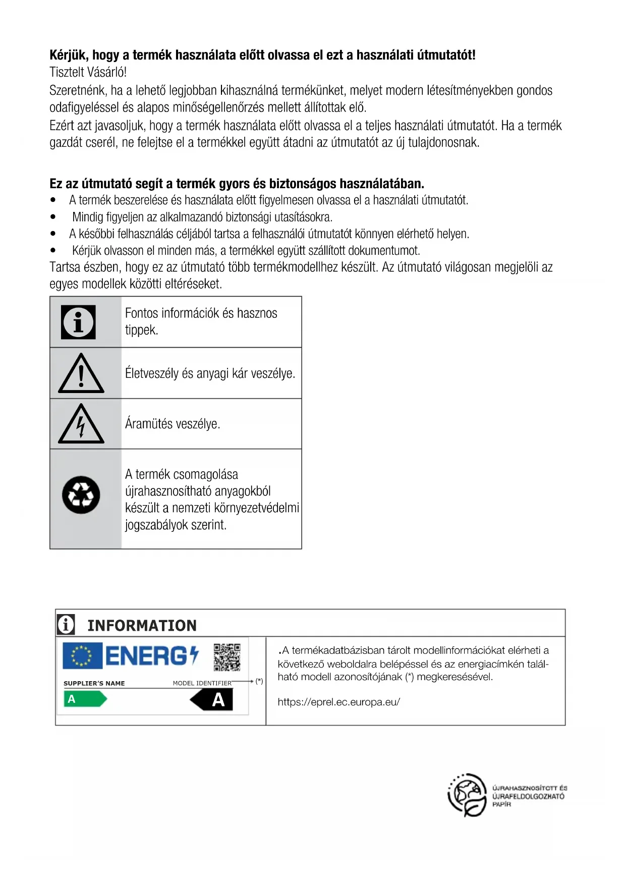 Áramütés veszélye. A termék csomagolása újrahasznosítható anyagokból készült a nemzeti környezetvédelmi jogszabályok szerint. .A termékadatbázisban tárolt modellinformációkat elérheti a következő weboldalra belépéssel és az energiacímkén talál-ható modell azonosítójának (*) megkeresésével.https://eprel.ec.europa.eu/
