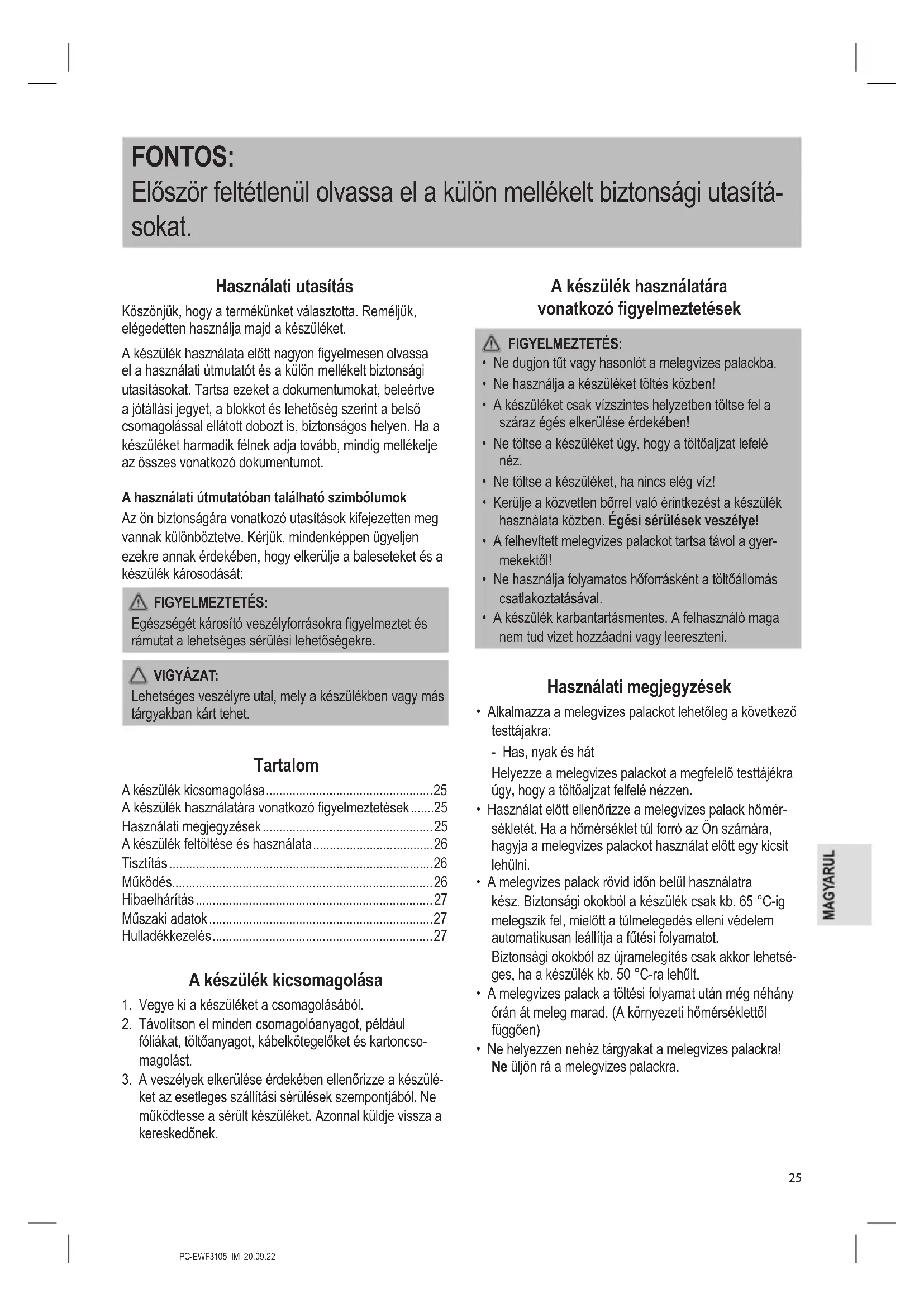 - Ne helyezzen nehéz tárgyakat a melegvizes palackra! Ne üljön rá a melegvizes palackra.PC-EWF3105_IM 20.09.22